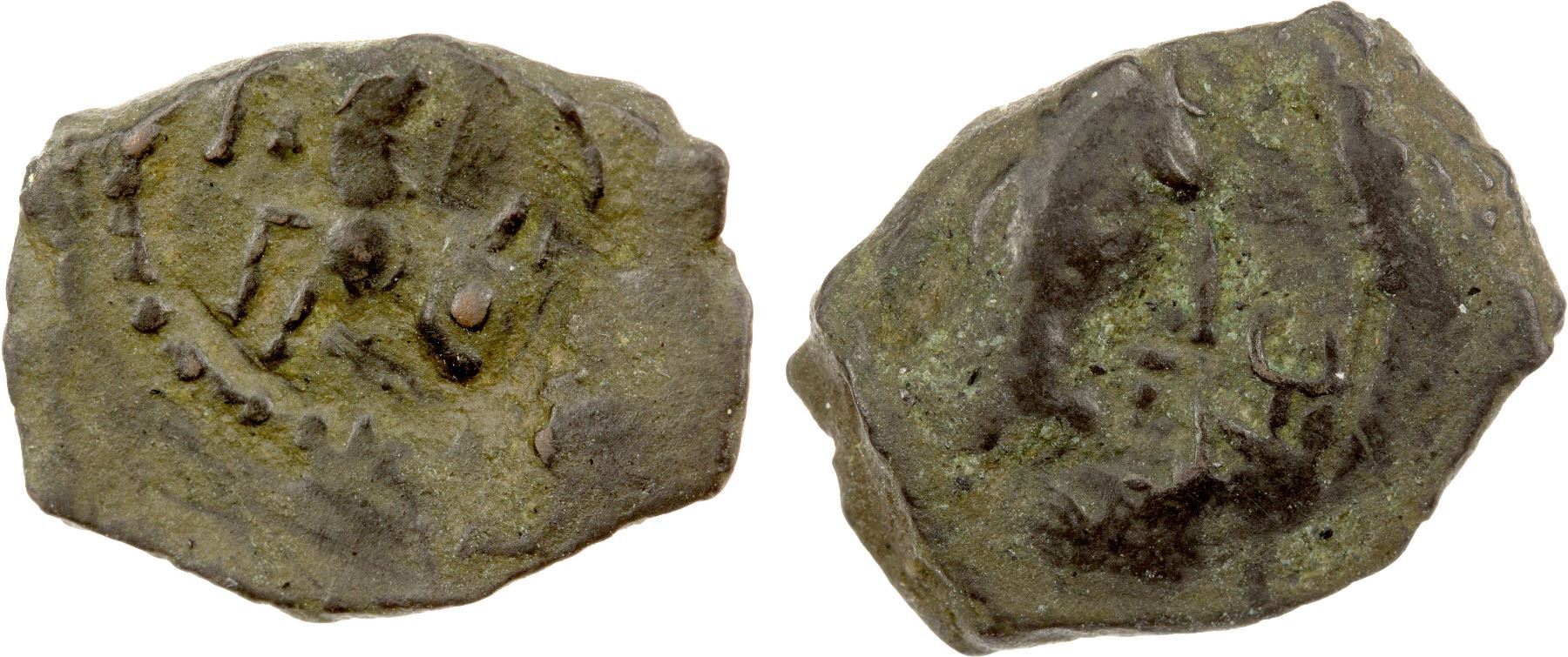 ALCHON HUNS: Uncertain king, ca. 4th/5th century AD, AE small unit (1.11g), G-, Vondrovec-48A, bust with elongated skull, Alchon tamgha to right // lion right, obverse weakly struck, crude VF, RR.
