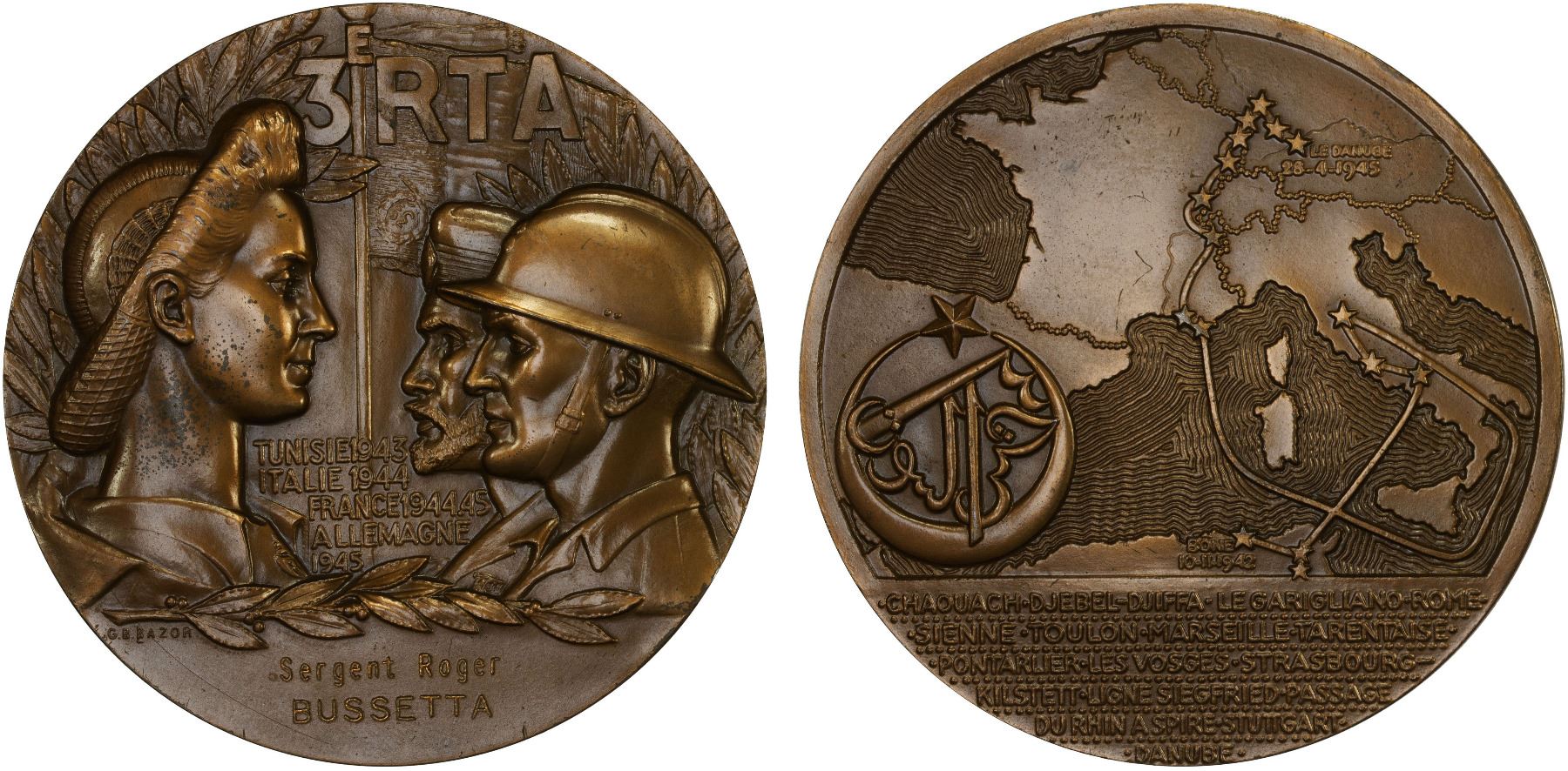 ALGERIA: AE medal (181.19g), 1945, 68mm bronze medal by G. B. L Bazor for the Third Algerian Rifle Regiment; TUNISIE 1943 / ITALIE 1944 / FRANCE 1944.45 / ALLEMAGNE 1945 between two soldiers facing an allegory of the French Republic, hand inscribed issue to SERGENT ROGER / BUSSETTA below // Map of Europe and the Mediterranean with the journey of the 3rd RTA, between Bône in November 1942 and the Danube in April 1945; in the exergue, list of the main battles and highlights, regimental insignia in Arabic at left, struck at the Monnaie de Paris, with 1978, cornucopia privy mark, and BRONZE on edge, Unc. The 3rd Algerian Rifle Regiment was one of the five most decorated infantry regiments of the Second World War along with the 4th Tunisian Rifle Regiment, the 2nd Moroccan Goumiers Group, the Chad Marching Regiment and the 13th Foreign Legion Demi-Brigade.