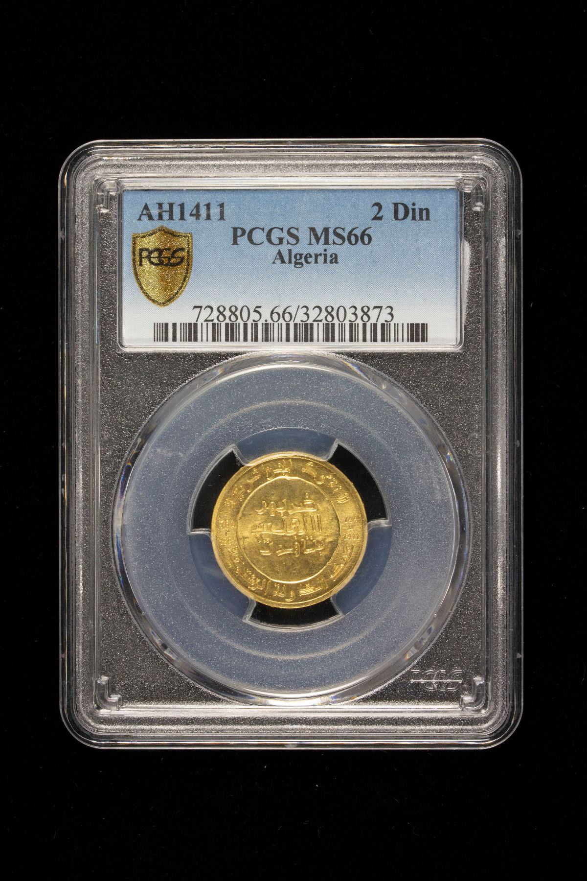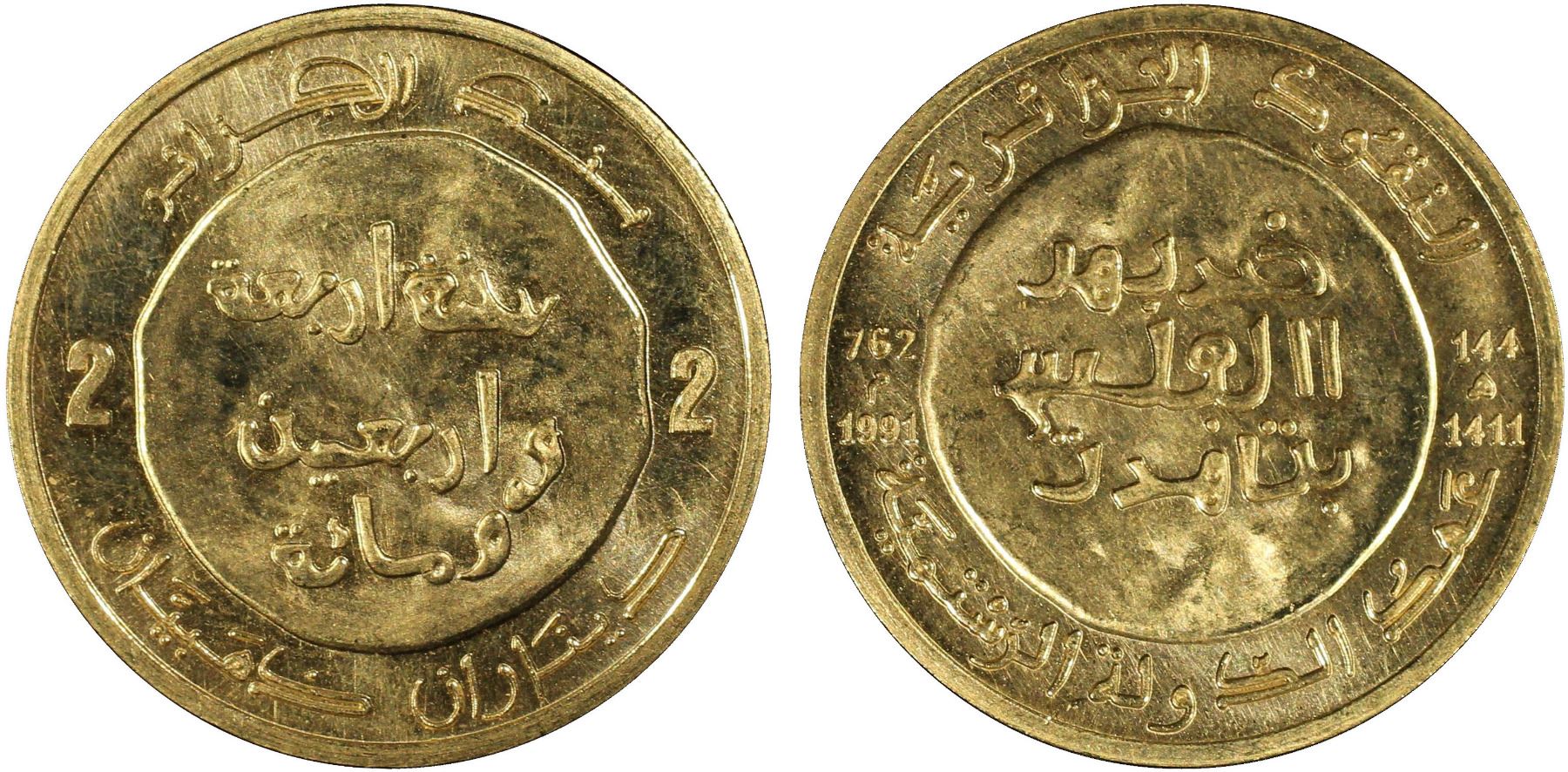 ALGERIA: Republic, AV 2 dinars, 1991/AH1411, KM-121, illustrating obverse and reverse of an anonymous Rustamid copper fals of the Algerian mint of Tahirt dated AH144 (= 762 AD), PCGS graded MS66.