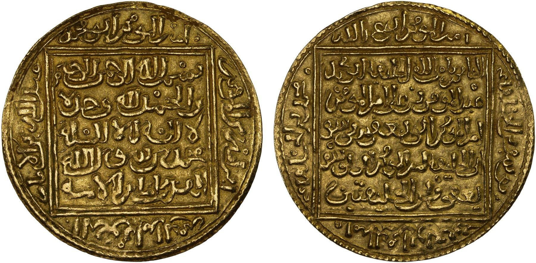 ALMOHAD: Abu Ya'qub Yusuf II, 1213-1224, AV dinar (4.64g), NM, A-486, H-508, complex margin legends, citing Abu Ya'qub Yusuf on the reverse, his father Abu 'Abd Allah Muhammad on the obverse margin; wonderful strike, choice XF, RR.