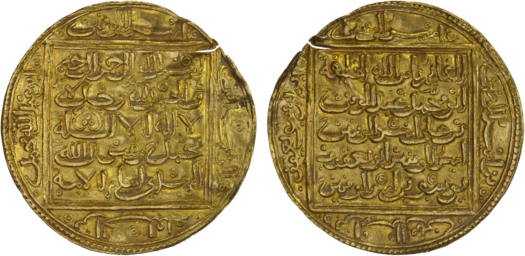 ALMOHAD: Abu Yusuf Ya'qub, 1184-1199, AV dinar (4.54g), NM, ND, A-484, Hazard-502, excellent strike, modestly wavy surfaces, small edge split, XF.