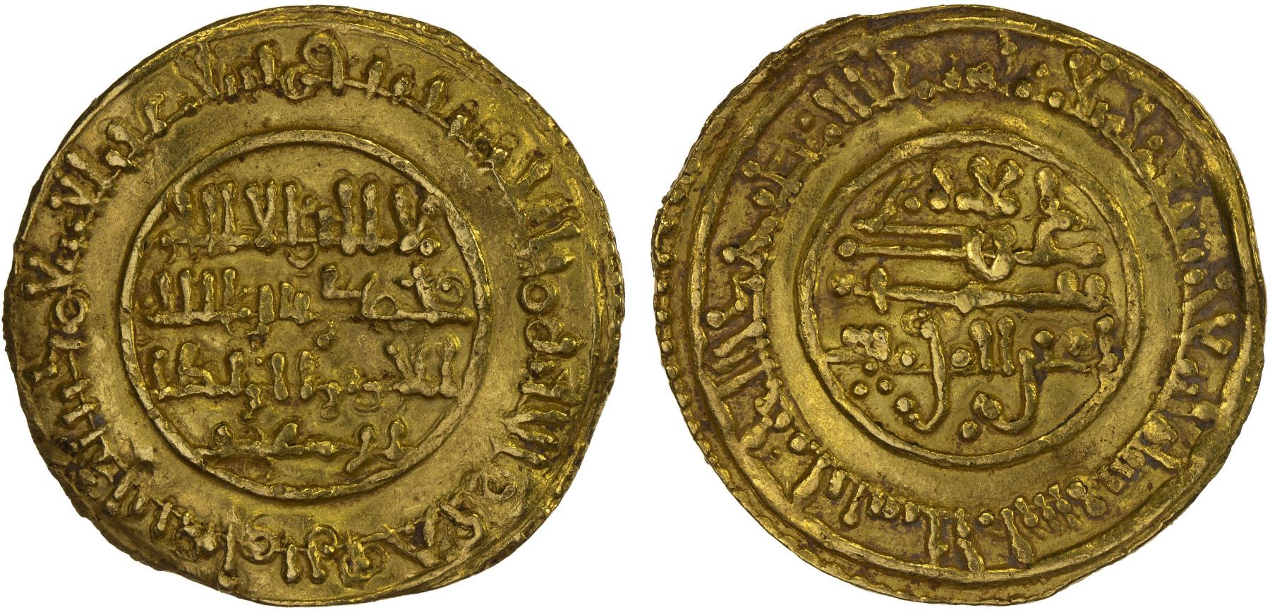 ALMORAVID: Abu Bakr, 1056-1087, AV dinar (4.13g), Sijilmasa, AH454, A-461.2, Hazard-30, somewhat crudely engraved dies, as for all known examples dated AH454; slightly uneven surfaces, XF, RRR.