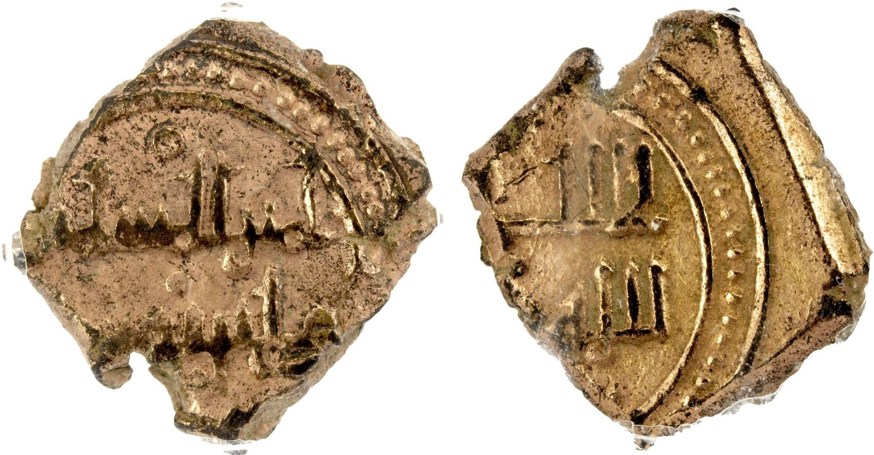 ALMORAVID: 'Ali, 1106-1142, AV fractional dinar, NM, ND, A-466E, VyE-1845, PyV-449, Vaño-314/17, first half of the kalima // name of 'Ali b. Yusuf plus his title amir al-muslimin; very pale gold, stylistically similar to contemporary Spanish fractions, ANACS graded EF45, RR. Cited by Vaño as a handusi, but it seems likely that all such examples were struck as "handusi" style and that "full strikes" do not exist.