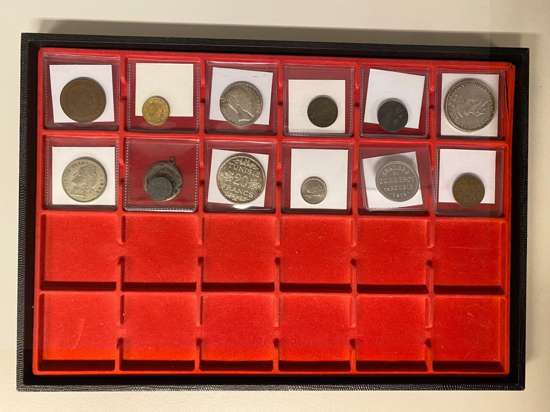 AMERICAS: LOT of 13 coins, including Dominican Republican (1/2 peso 1897), El Salvador (AR peso 1908), French Guinea (2 sous 1783), Haiti (centime 1846 year), Mexico (2, incl. Maximilian AR 50 centavos 1866), Uruguay (2 19th century coppers), plus one each of French Algeria, Seychelles, Tunisia (AR 20 francs AH1354), as well as two tokens; various conditions, some EF to Unc; retail value $400, lot of 13 pieces.