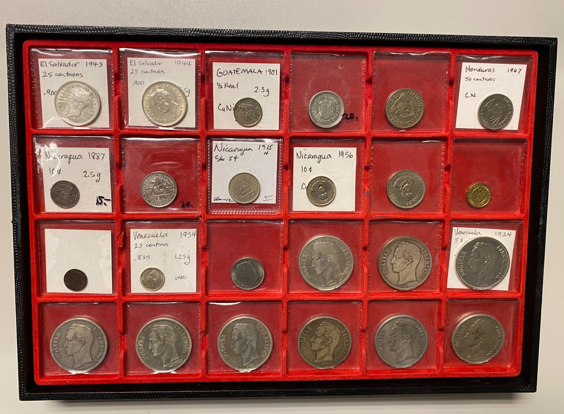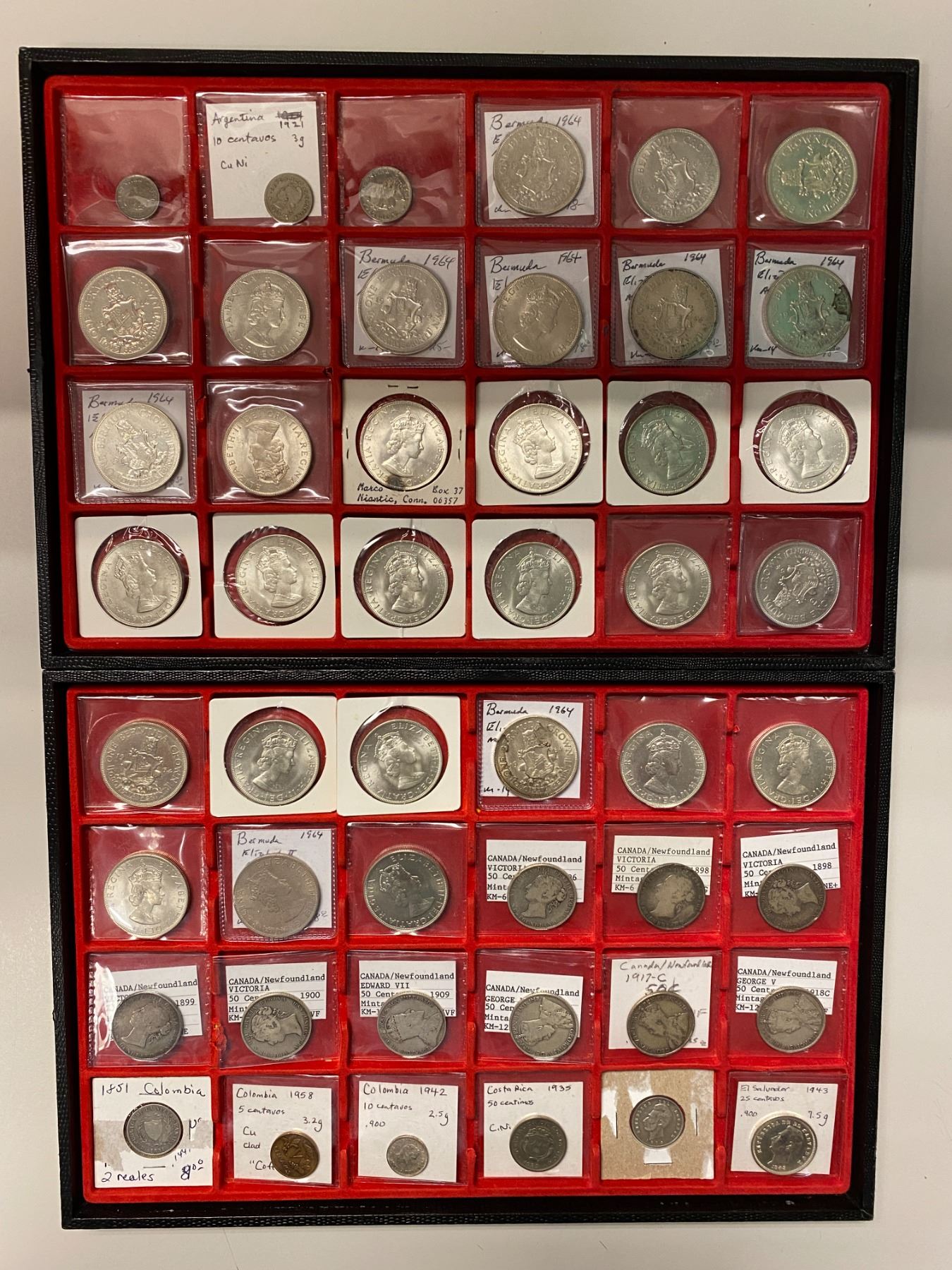 AMERICAS: LOT of 72 coins, including Argentina (3 pcs), Bermuda (30), Canada/Newfoundland (9), Colombia/Nueva Granada (1), Colombia/Republic (2), Costa Rica (1), Ecuador (1), El Salvador (3), Guatemala (2), Honduras (2), Nicaragua (5), Paraguay (1), Spain (1), and Venezuela (11); average circulated grades, with many uncs, most are silver, in consignor's 2x2 holders, viewing recommended; retail value $825, lot of 72 coins.