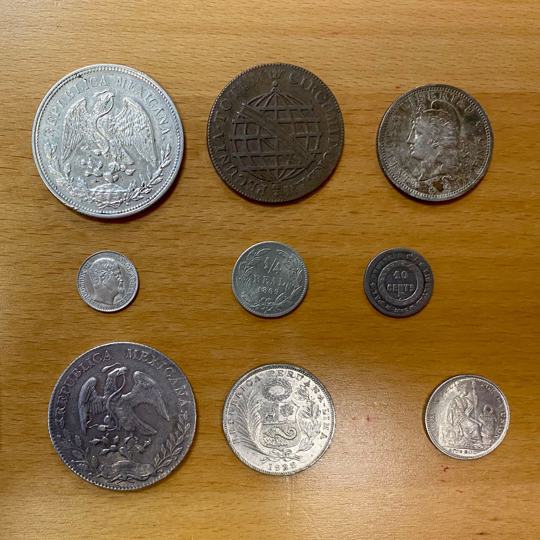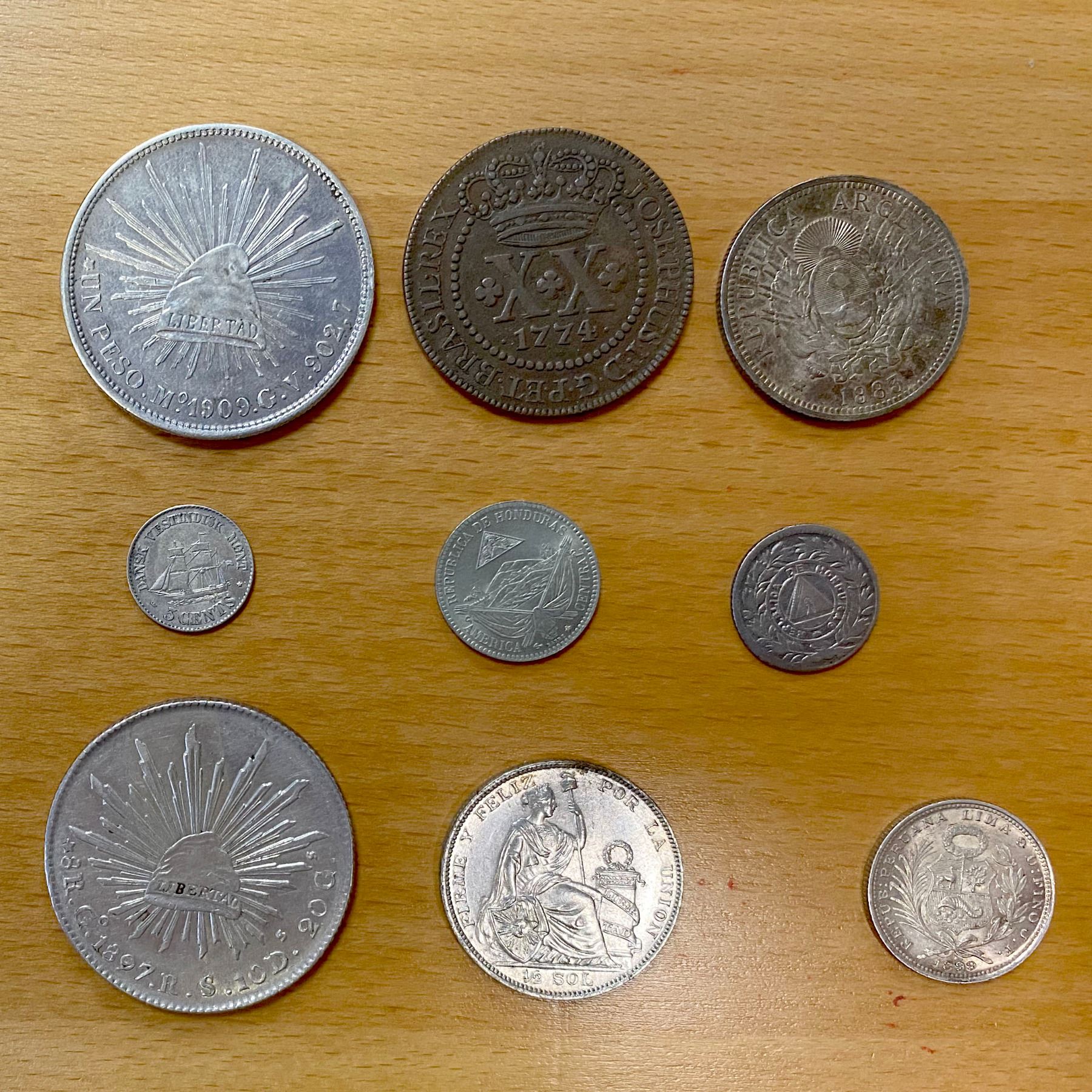 AMERICAS: LOT of 9 coins, including Argentina: AR 50 centavos 1883; Brazil: AE 20 reis 1774; Danish West Indies: AR 5 cents 1859; Honduras: CuNi ¼ real 1869-A (AU, light hairlines), AR 10 centavos 1895; Mexico: AR 8 reales 1897-Go, AR peso 1909-Mo; Peru: AR ½ sol 1929, AR 1/5 sol 1899 (Unc); most examples with some hairlines; retail value $300, lot of 9 pieces.