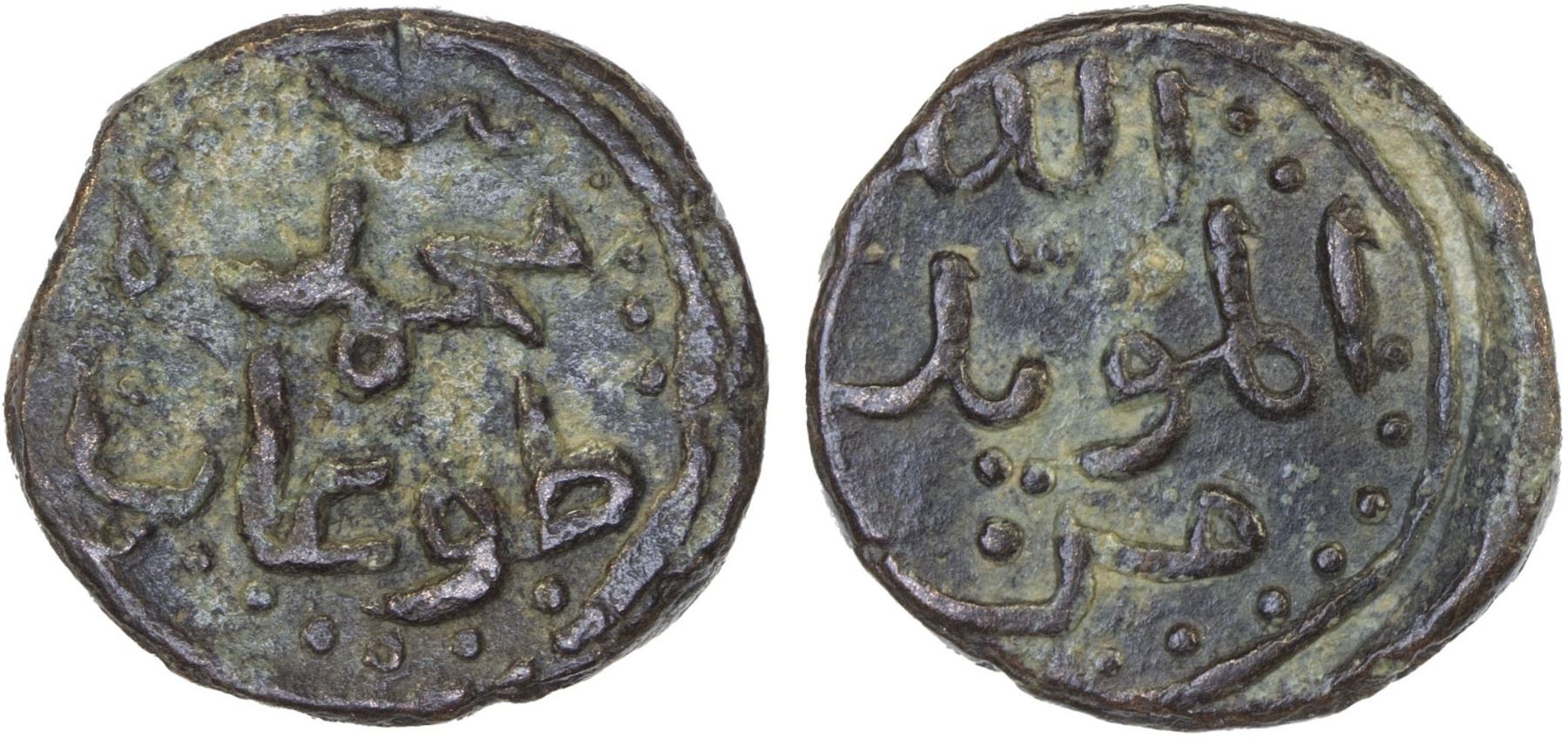 AMIR OF NISHAPUR (?): Muhammad b. Toghanshah, AE fals (4.29g), NM, ND, A-1708D, obverse legend just muhammad bin / toghan, reverse al-mu'ayyid min Allah ("supported by God"); this is only a tentative attribution, though it seems quite reasonable that muhammad is part of the full name of the Amir Sanjar b. Toghanshah (A-1708D), who ruled in Nishapur AH581-583 (1185-1187 AD), bold VF-XF, RRR. Cf. our auction 47, lot 471, with his full name "toghanshah" on the obverse but struck from the same reverse die!
