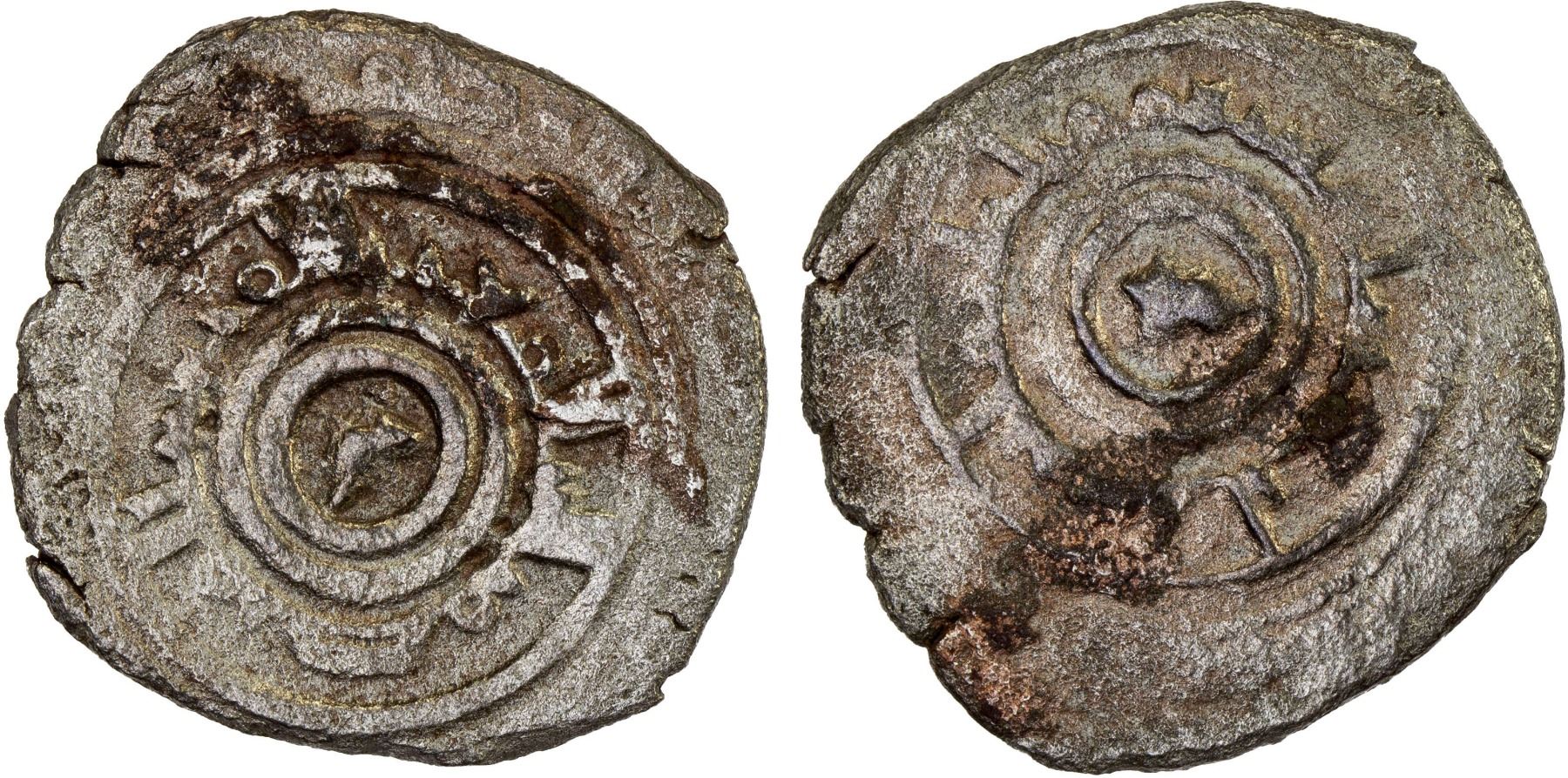 AMIRS OF FÈS : Hamama b. al-Mu'izz, 422-440, AR dirham (2.53g), MM, ND/DM, A-H458, derived from the regular issues of al-'Aziz (AH 365-387 / 975-997 AD); very similar to an example with the clear mint Madinat Fas & date 431 (sold in our Auction 50, lot 191) but very weakly struck with all of the outer legends off flan on both sides; much surface porosity, crude Fine, RRR.