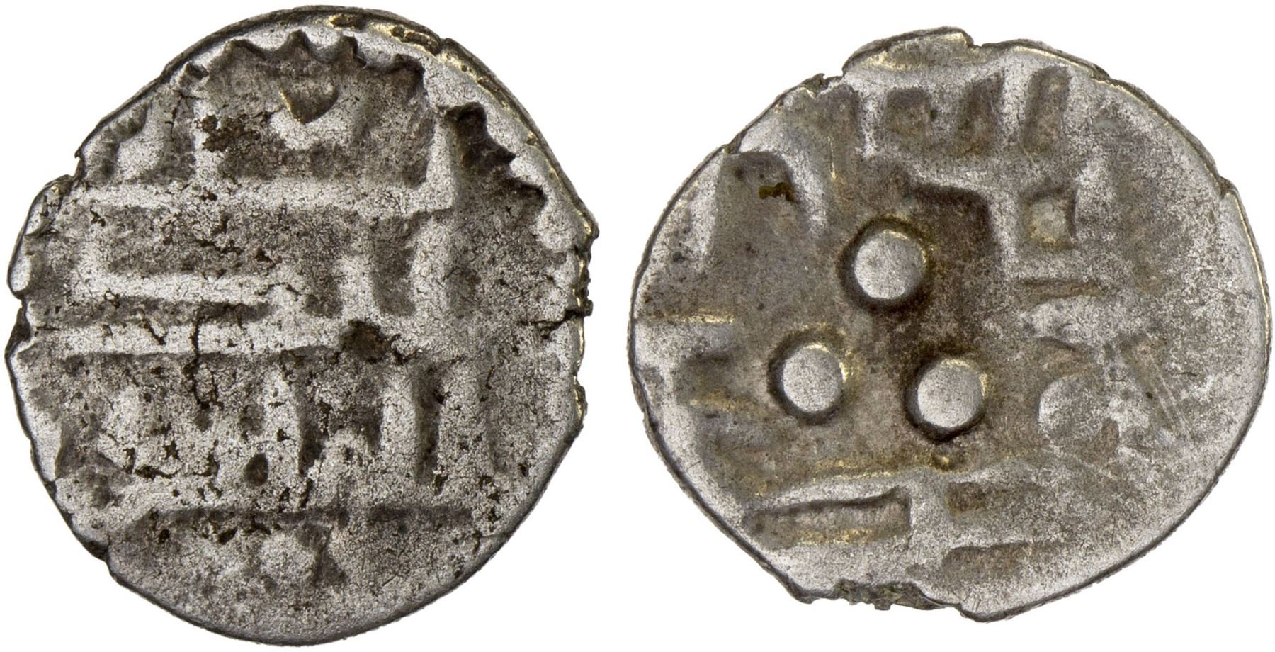 AMIRS OF MULTAN: 'Abd al-Malik, ca. 717 until before 720, AR damma (0.63g), A-4567, FT-M25, Arabic lillah / 'abd / al-malik, 2 pellets below // full Sharada legend, the altar base below, exceedingly rare, two known to Fishman, with one listed on CoinArchives (sold in our Auction 52, lot 658), VF, RRR. This governor was likely 'Abd al-Malik b. Misma', appointed to Sind & Multan by the Umayyad caliphate circa 717-720.