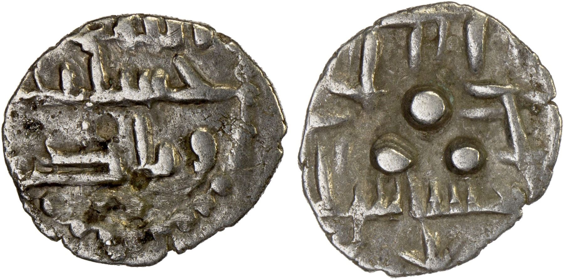 AMIRS OF MULTAN: Hassân I, ca. 800±, AR damma (0.57g), A-4574, FT, Arabic obverse, lillah wali / hassas / wa nâsir, and standard reverse, with hassas lillah in a single line below the 3 pellets and with a star below; apparently a previously unknown subtype for Hassan., choice VF-XF, RRRR. It is not known why the ruler's name always appears as Hassâs rather than Hassân on both obverse & reverse.