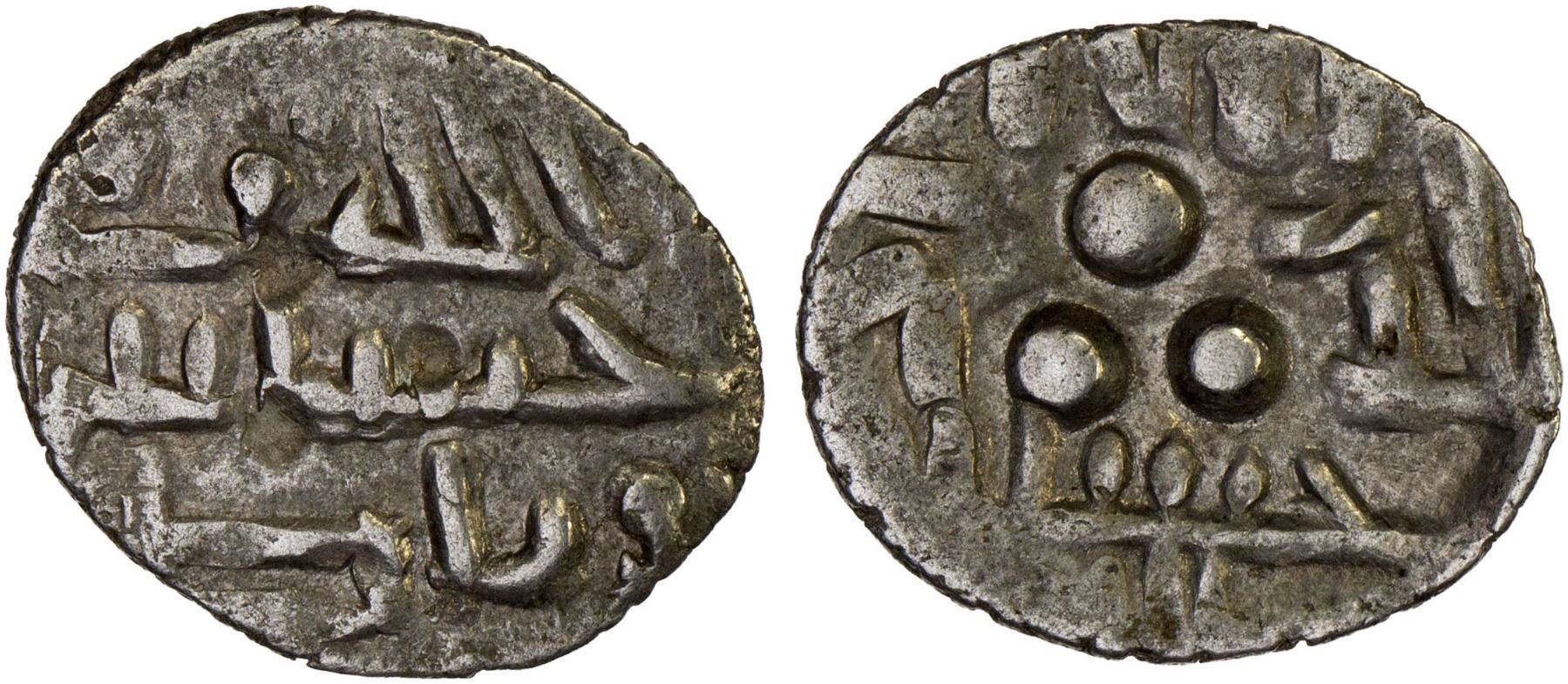 AMIRS OF MULTAN: Hassan, ca. 800±, AR damma (0.62g), A-4574, FT-M48, Arabic obverse, lillah wali / hassân / wa nâsir, and standard reverse, with hassan / lillah below the 3 pellets, bold VF, RR. The governor's name is inscribed "hassâs" rather than "hassân" on all examples of this governor.