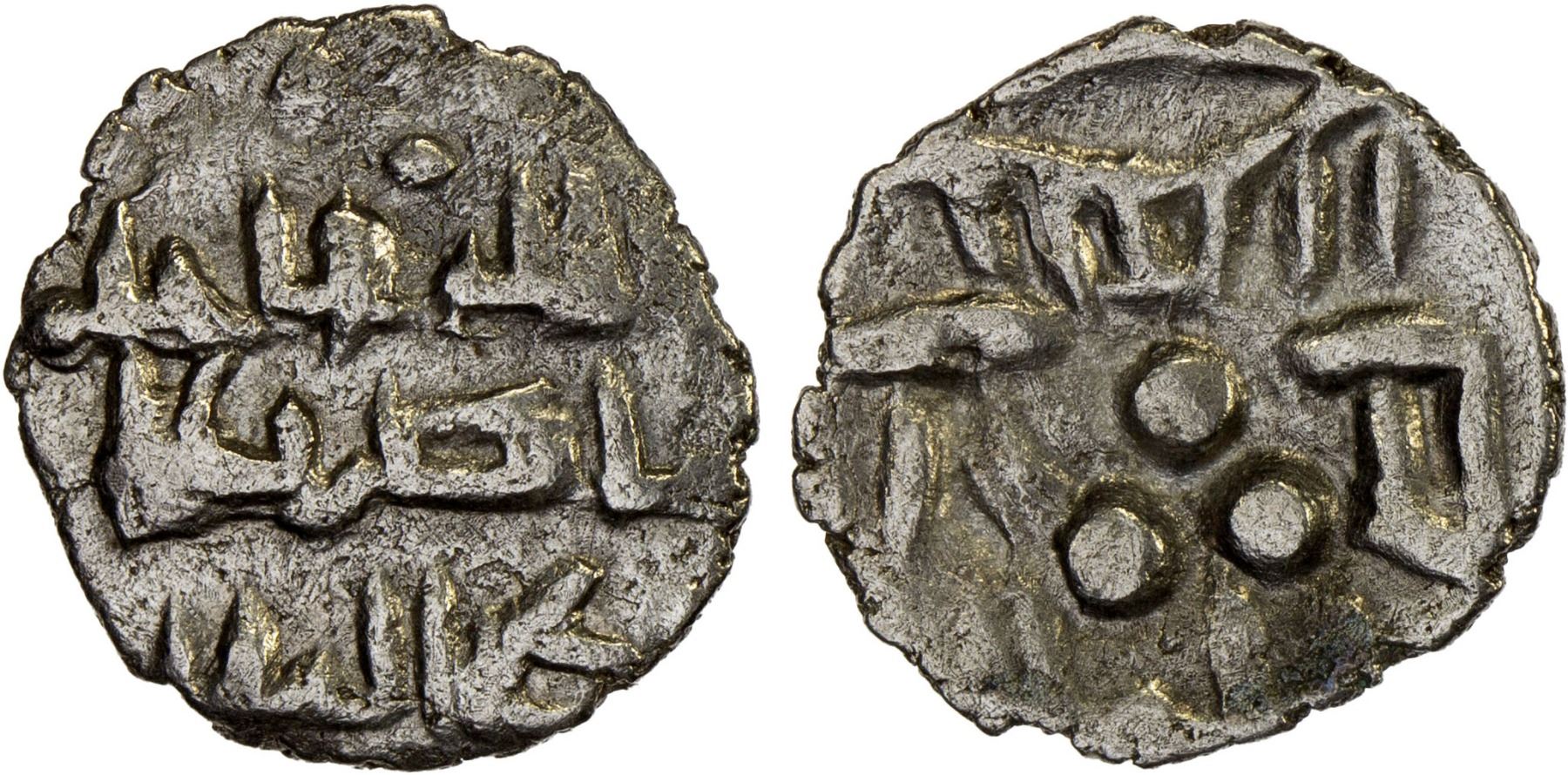 AMIRS OF MULTAN: Jalam I, ca. 750-775, AR damma (0.50g), A-4571, FT-M33, long obverse Arabic text, tentatively read as Allah wali jala- / -m nasir 'ab- / -d Allah lillah ("God is the Friend of Jalam, sincere and the servant of God, for God"), with two pellets below // standard reverse with jalam lillah, VF-XF, RRR. Fishman knew of just 1 example; there are 2 more on CoinArchives, both sold in our Auction 52, lots 659 & 660.