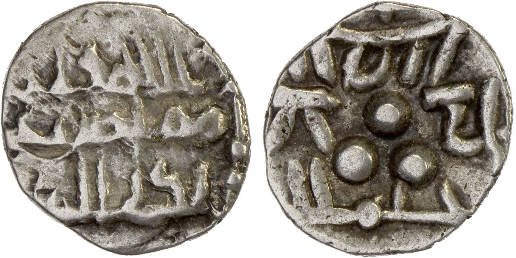 AMIRS OF MULTAN: Jalam I, ca. 750-775, AR damma (0.69g), A-4571, FT-M33, long obverse Arabic text, tentatively read as Allah wali jala- / -m nasir 'ab- / -d Allah lillah ("God is the Friend of Jalam, sincere and the servant of God, for God"), with two pellets below, standard reverse with jalam lillah, VF-XF, RRR. Fishman knew of just 1 example; there are 2 more on CoinArchives, both sold in our Auction 52, lots 659 & 660.