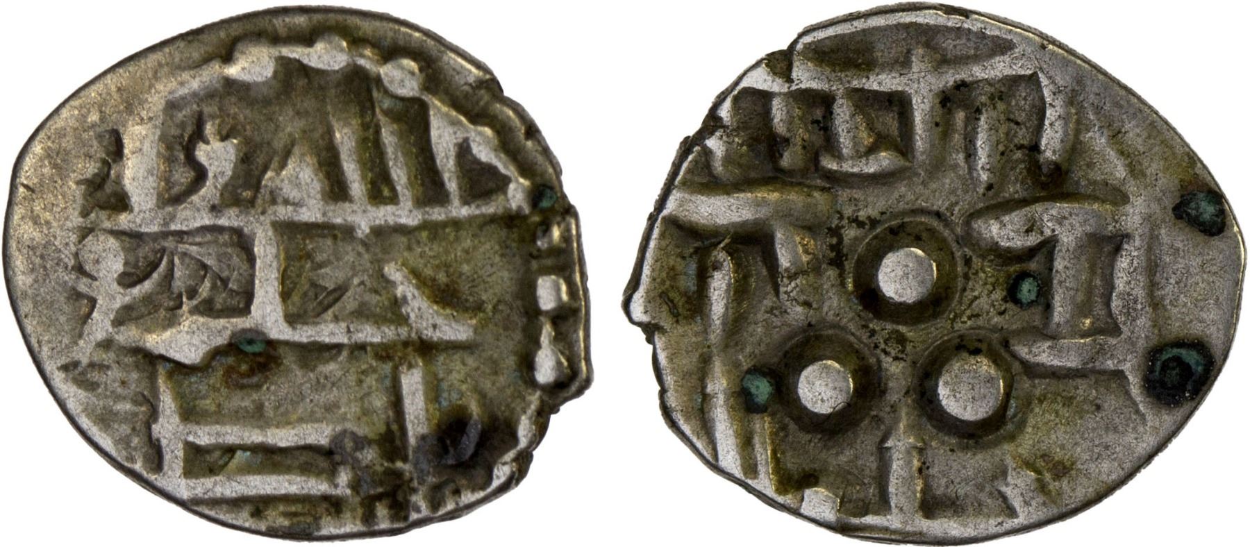 AMIRS OF MULTAN: Jalam I, ca. 750-775, AR damma (0.77g), A-4571A, FT-M34/37, obverse legend lillah wali / jamal wa / nasir // 3 pellets in center, jalam lillah below, bold VF, R.