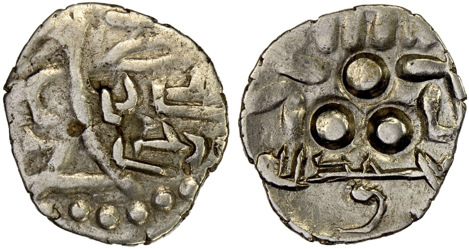 AMIRS OF MULTAN: Muhammad I, ca. 720s-750s, AR damma (0.46g), A-4569, FT-M30, with the Arabic legend tentatively read as rabbî ... / wa nasrihi within traces of a ruler's "head" // three large pellets, wa muhammad lillah below, XF, RRR.