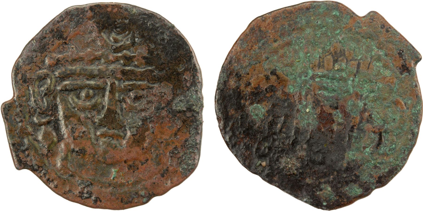 ANCIENT CENTRAL ASIA: Anonymous, ca. 4th/6th century, AE small unit (1.43g), facing head, wearing simple crown and two earrings // Sasanian-style fire altar and two attendants; uncertain region of issue, perhaps somewhere near Bukhara, F-VF, RR. Cf. Zeno-309757 for a somewhat similar obverse, but totally different reverse.