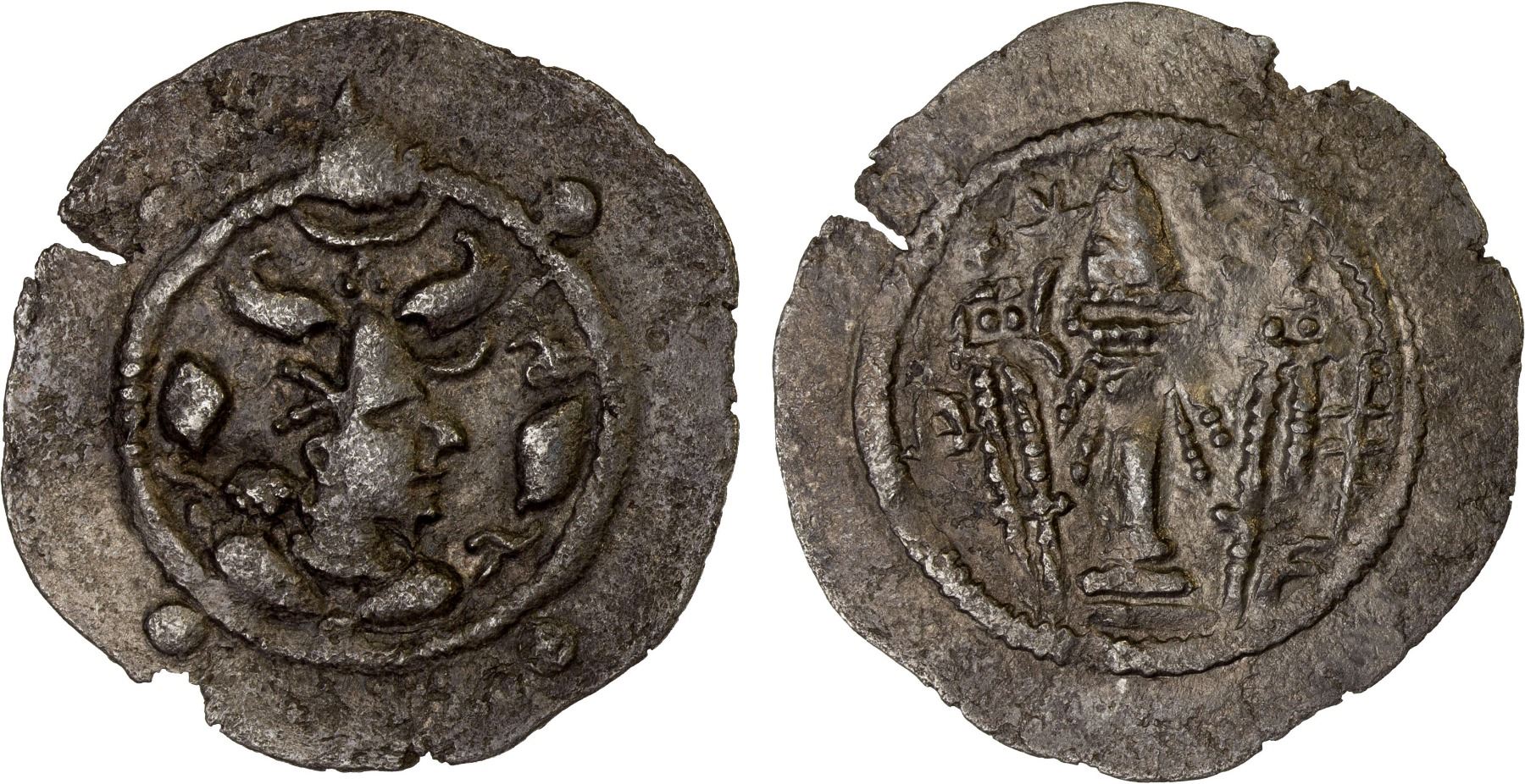 HEPHTHALITE: Alxon/Chionite, ca. 475-565, AR drachm (3.04g), Mitch-1455/56, G-287, Peroz type, four pellets in obverse margin, Pahlavi letter M to left and Bactrian arxon in lieu of mint name to right on reverse, VF.
