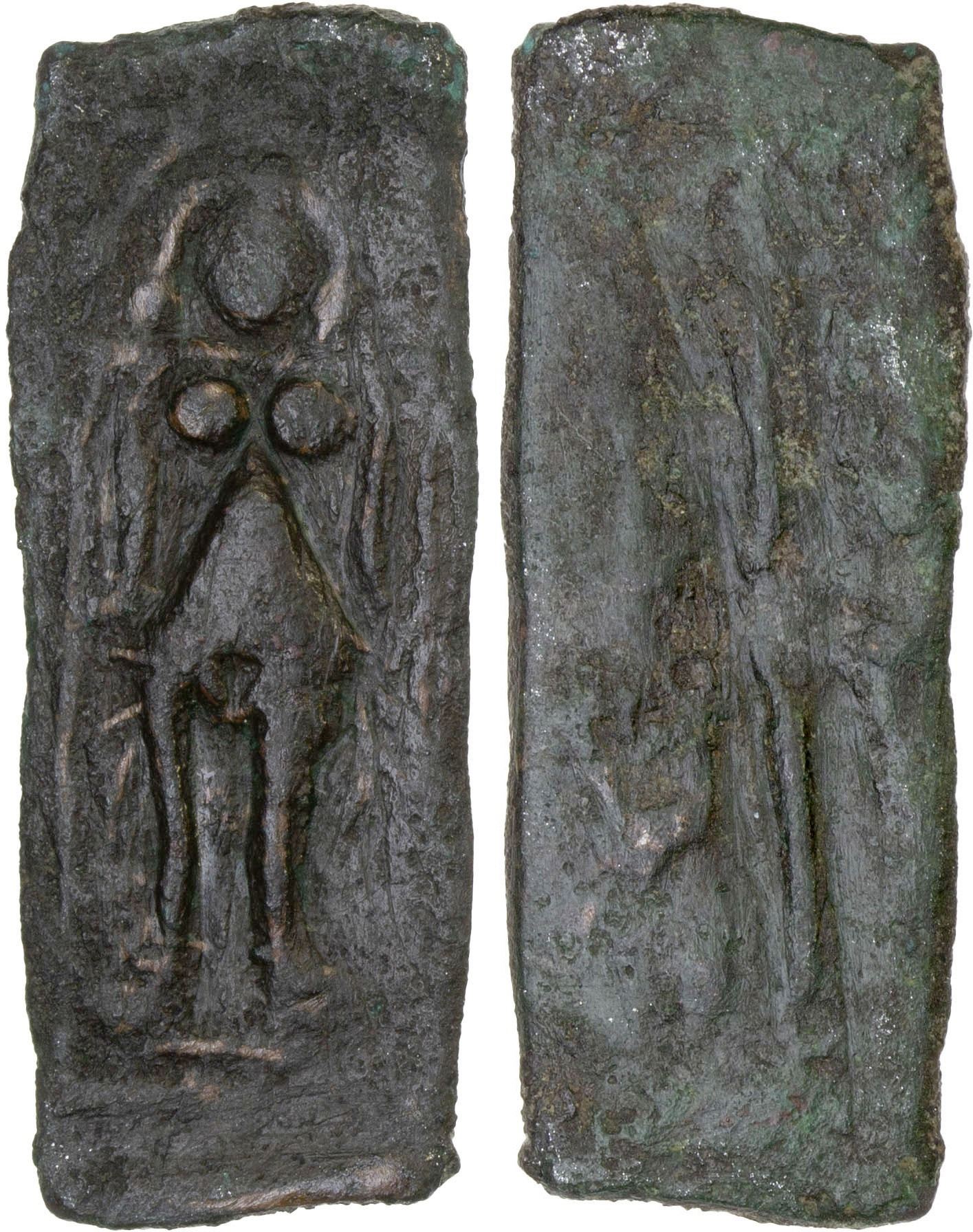 CEYLON: Anonymous, 1st-2nd century AD, AE plaque (2.42g), Mitch-5051, smaller version of Pieper-3221, Lakshmi standing on lotus, grasping 2 stalks, 2 small elephants at the top, watering Lakshmi's head // swastika-standard plus 2 unclear symbols, Fine, RR. There are three basic "denominations": large size lead (average 6.0g to 8.0g 32-35mm), medium copper (average 2.5g t0 4.0g, 28-30mm, and small copper (average 1.0g to 2.0g, 16-19 mm).