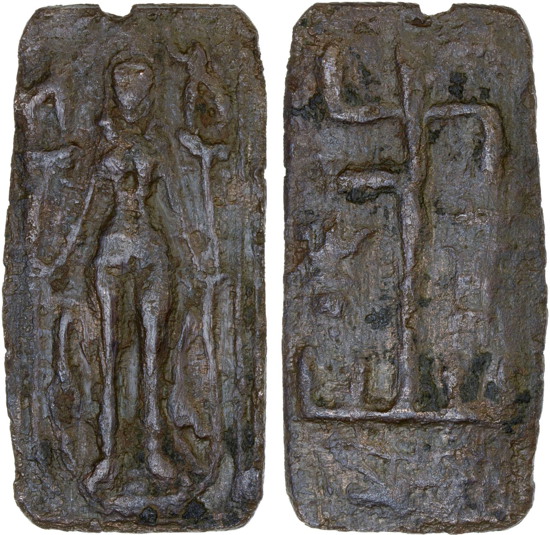 CEYLON: Anonymous, 1st-2nd century AD, AE plaque (4.24g), Mitch-5051, smaller version of Pieper-3221, Lakshmi standing on lotus, grasping 2 stalks, 2 small elephants at the top, watering Lakshmi's head // swastika-standard with inverted small standard & nandipada; lovely example! choice VF, RR. There are three basic "denominations": large size lead (average 6.0g to 8.0g 32-35mm), medium copper (average 2.5g t0 4.0g, 28-30mm, and small copper (average 1.0g to 2.0g, 16-19 mm).