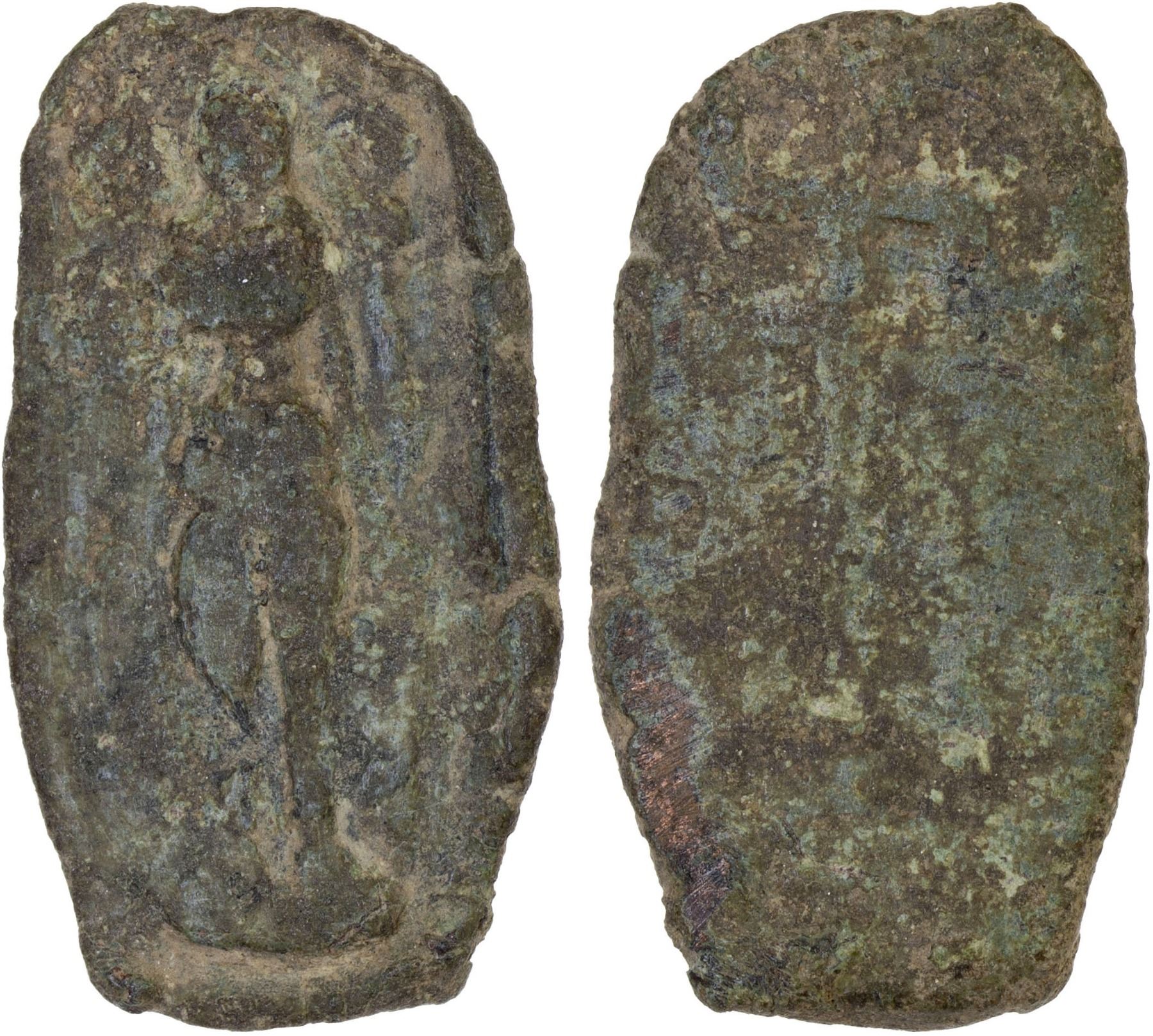 CEYLON: Anonymous, 1st-2nd century AD, lead plaque (7.22g), Mitch-5048/49, Pieper-3220, Lakshmi standing on lotus, grasping 2 stalks, 2 small elephants at the top, watering Lakshmi's head // swastika-standard, VG, R. There are three basic "denominations": large size lead (average 6.0g to 8.0g 32-35mm), medium copper (average 2.5g t0 4.0g, 28-30mm, and small copper (average 1.0g to 2.0g, 16-19 mm).