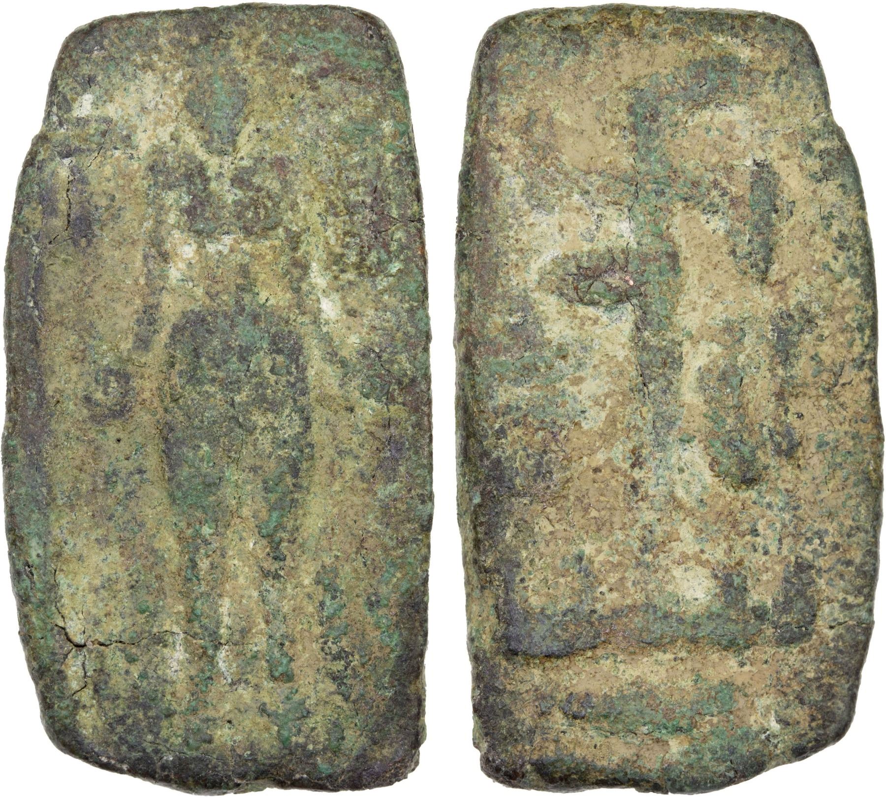 CEYLON: Anonymous, 1st-2nd century AD, lead plaque (7.57g), Mitch-5048/49, Pieper-3220, Lakshmi standing on lotus, grasping 2 stalks, 2 small elephants at the top, watering Lakshmi's head // swastika-standard, F-VF, RR. There are three basic "denominations": large size lead (average 6.0g to 8.0g 32-35mm), medium copper (average 2.5g t0 4.0g, 28-30mm, and small copper (average 1.0g to 2.0g, 16-19 mm).