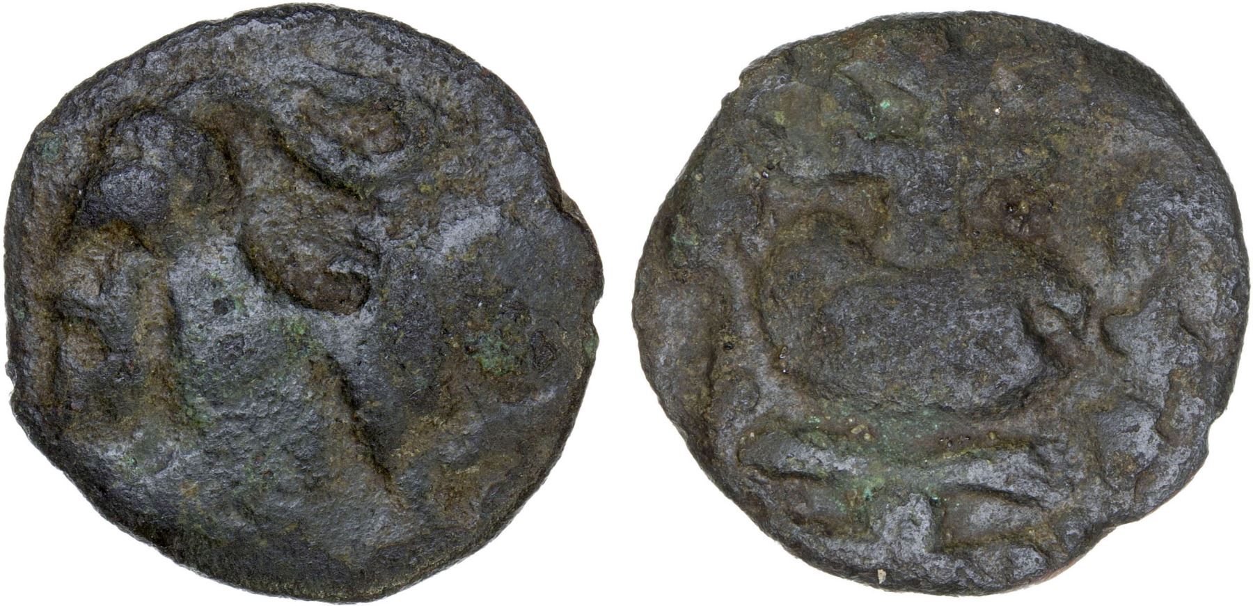 CEYLON: Anonymous, 7th/8th century, AE alloy unit (2.05g), Pieper-3233, lion right, left front paw raised // flower pot between two lamps, About Fine, RR.