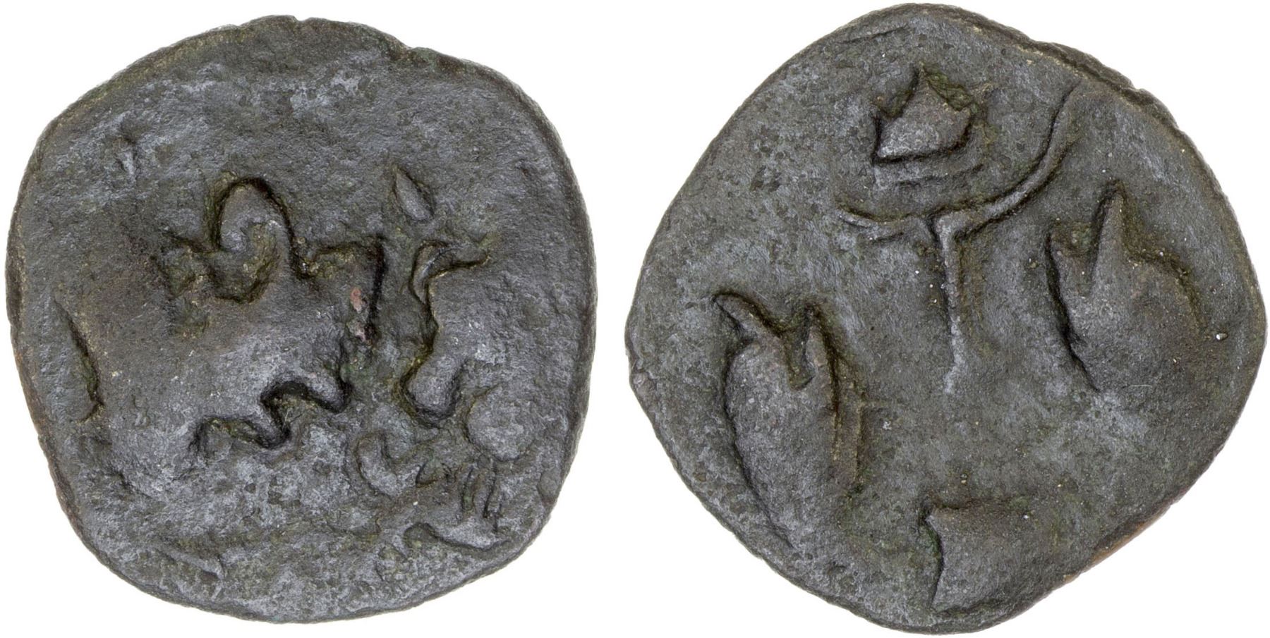 CEYLON: Anonymous, ca. 7th/9th century, AE unit (2.66g), Mitch, Pieper-3237, bull seated to right, flower pot to right // two fish facing upright, floral pattern above; extremely rare type we have not handled before, Fine, RRR.
