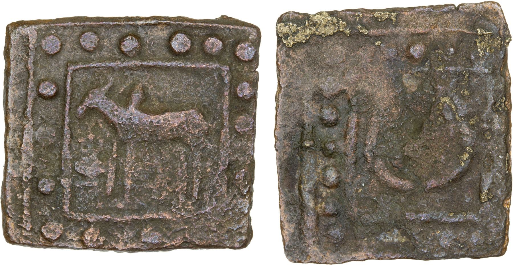 CEYLON: Anuradhapura Period, ca. 150 BC-100 AD, AE square unit (2.01g), Pieper-3229, cf. Zeno-31248, humped bull left within border of pellets, pot symbol to left // 3 dots inside a circle; within a double square frame with pellets between; light porosity, attractive F-VF, RR.