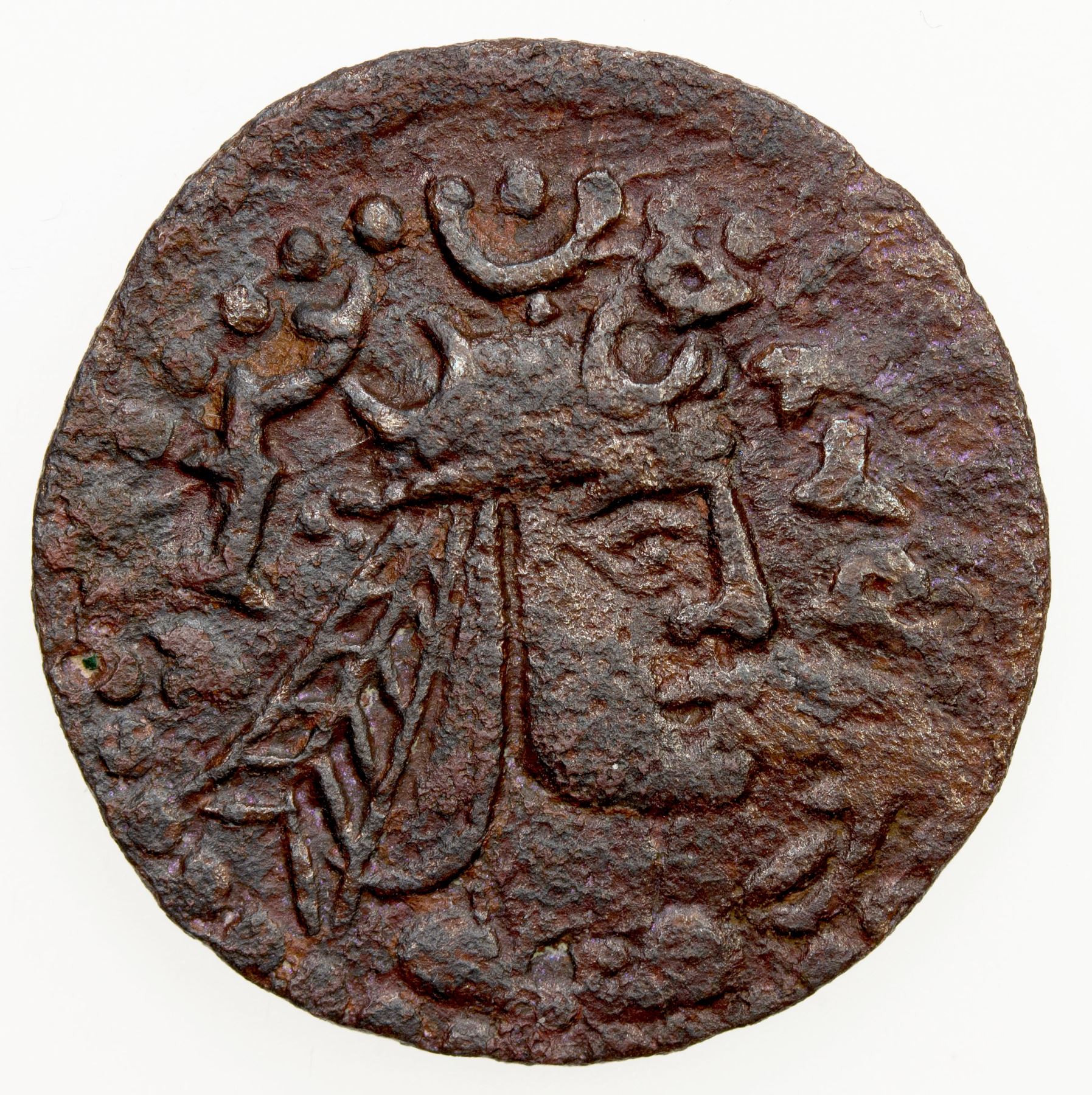 ANCIENT: CHORESMIA: Kanik, early 8th century, AE unit (4.19g), Vainberg G4.6-7, cf. Zeno-109704, bust right, wearing crown topped with three crescents // horseman right, holding whip, legends around on both sides, some porosity, choice VF-EF, ex Ralph A Cannito Collection.