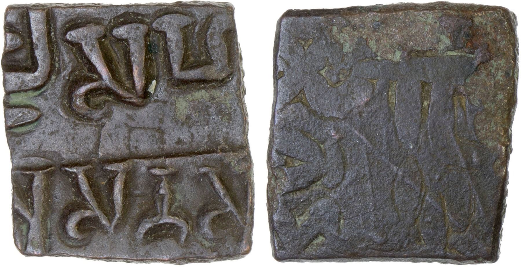 EASTERN MALWA: Betwa Valley: Sahasrasena, ca. 1st century AD, AE square unit (2.05g), as Pieper-960 but square, Brahmi legend [ra]jno sahasrasanasa // traces of the host legend, no countermark; superb quality, XF, RR, ex Ian Todd Collection.