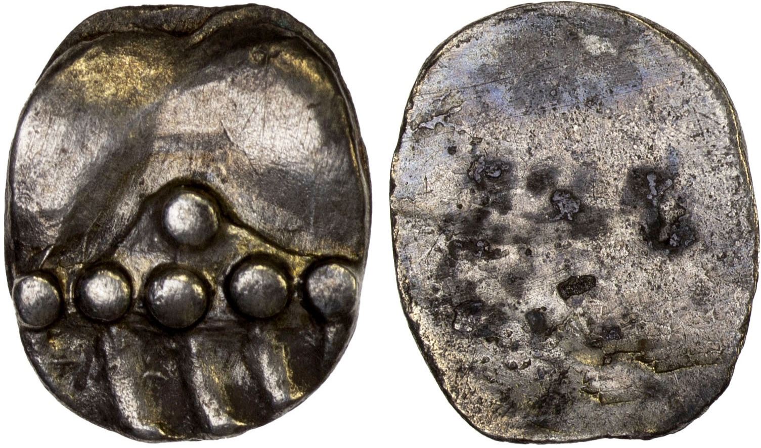 GANDHARA: Anonymous, ca. 650-800, AR double unit (2.88g), cf. GA-34 (only 4 dots), 6-dot type, without any inscription, uniface as always; appears to be a completely unpublished type, XF, RRR, ex Ian Todd Collection.