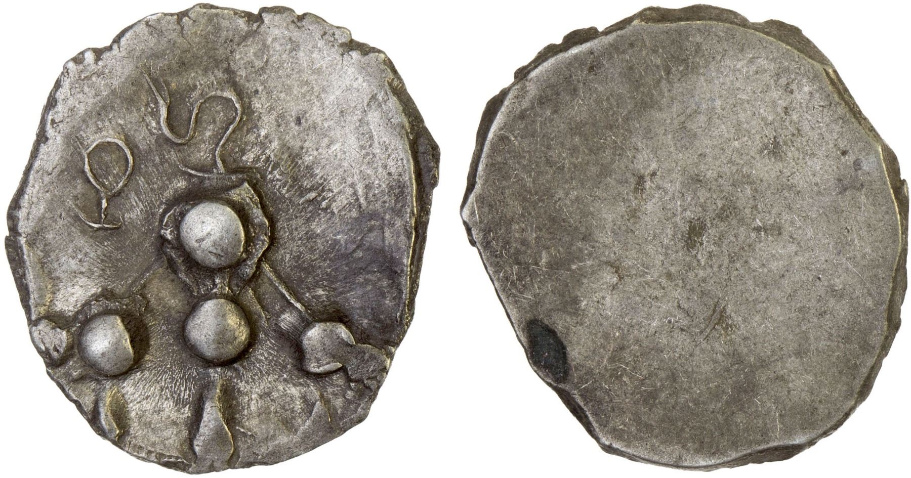 GANDHARA: Anonymous, ca. 650-800, AR unit (1.25g), FT-GA9, 4-dot series, Brahmi Ha Tha below; uniface, with consignor's full descriptions, XF, ex Ian Todd Collection.
