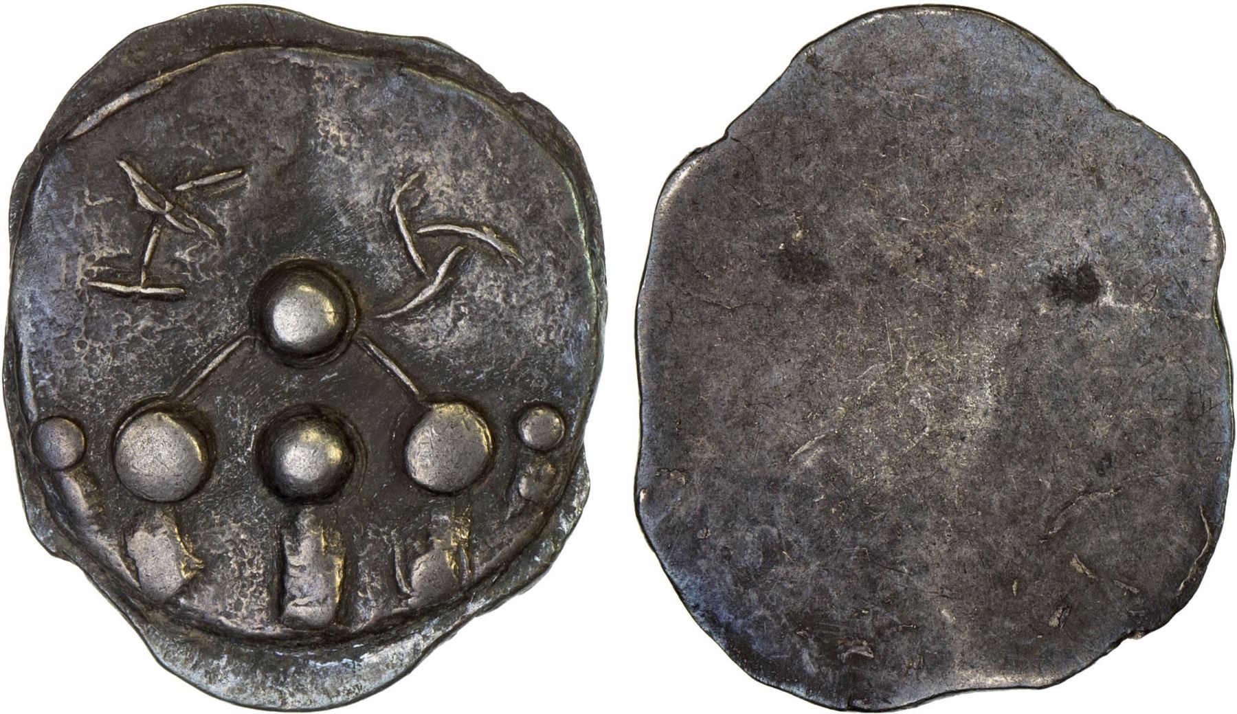 GANDHARA: Anonymous, ca. 650-800, AR unit (1.25g), FT-GA18.1 (this piece), 4-dot series, Brahmi VaKa below (tentative reading); uniface, with consignor's full descriptions, XF, ex Ian Todd Collection.