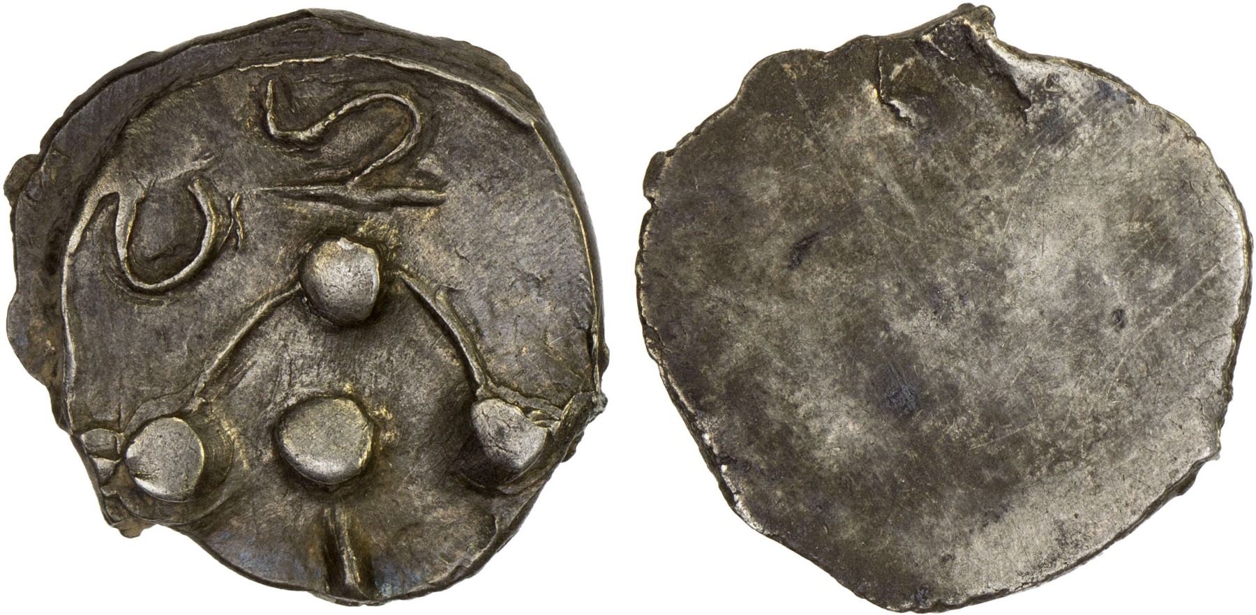 GANDHARA: Anonymous, ca. 650-800, AR unit (1.28g), FT-GA6, 4-dot series, Brahmi HaGu below; uniface, with consignor's full descriptions, XF, ex Ian Todd Collection.