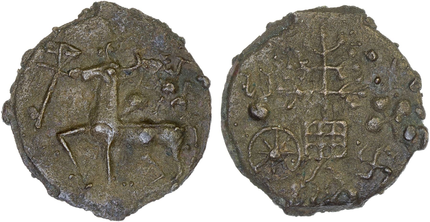 KAUSAMBI: Anonymous, 2nd century BC, AE large unit (6.59g), Pieper-1129, lanky bull left, Indradhvaja to left, nandyavarta above // ornate railed tree in center, chakra left, nandipada above, swastika right with Ujjain symbol above, and 6-arch hill below; decent example, VF-XF.