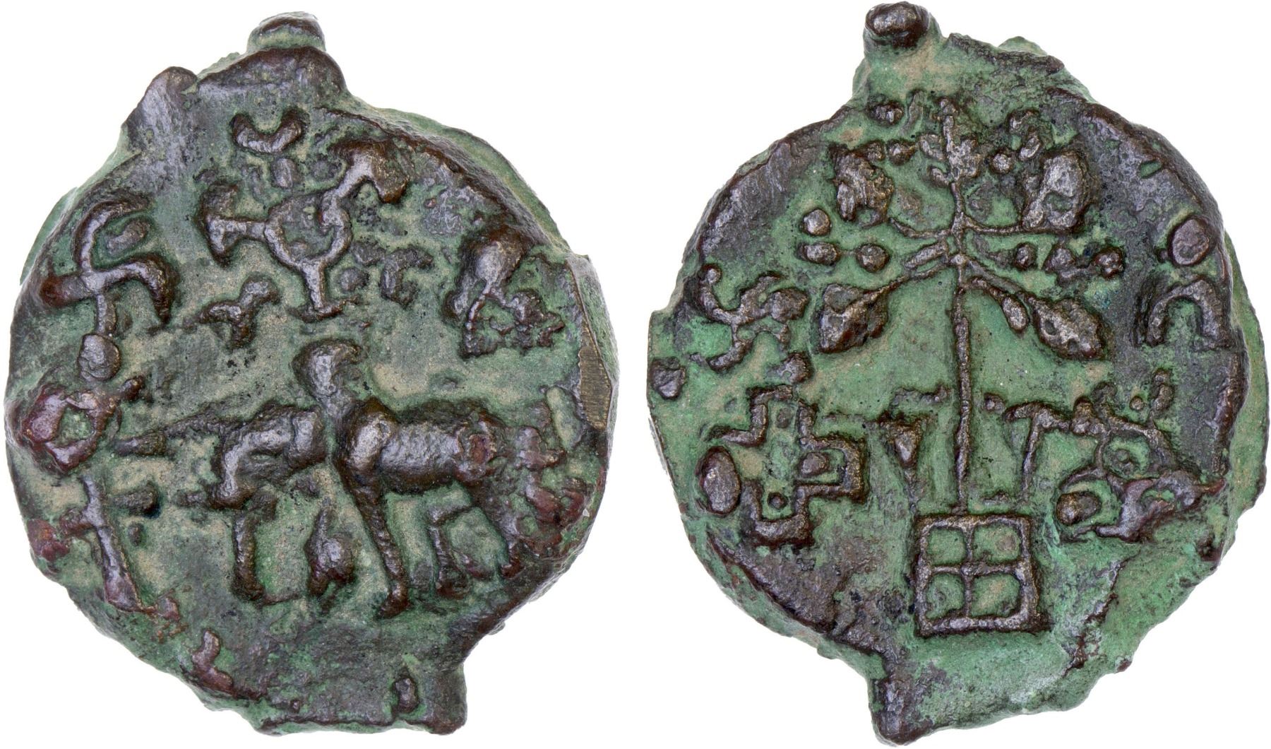 KAUSAMBI: Anonymous, 2nd century BC, AE unit (3.99g), Pieper-1103, elephant left, Indradhvaja & swastika to left, 6-arm symbol above // railed tree, hollow cross & swastika left, hill right; excellent example! choice VF-XF.