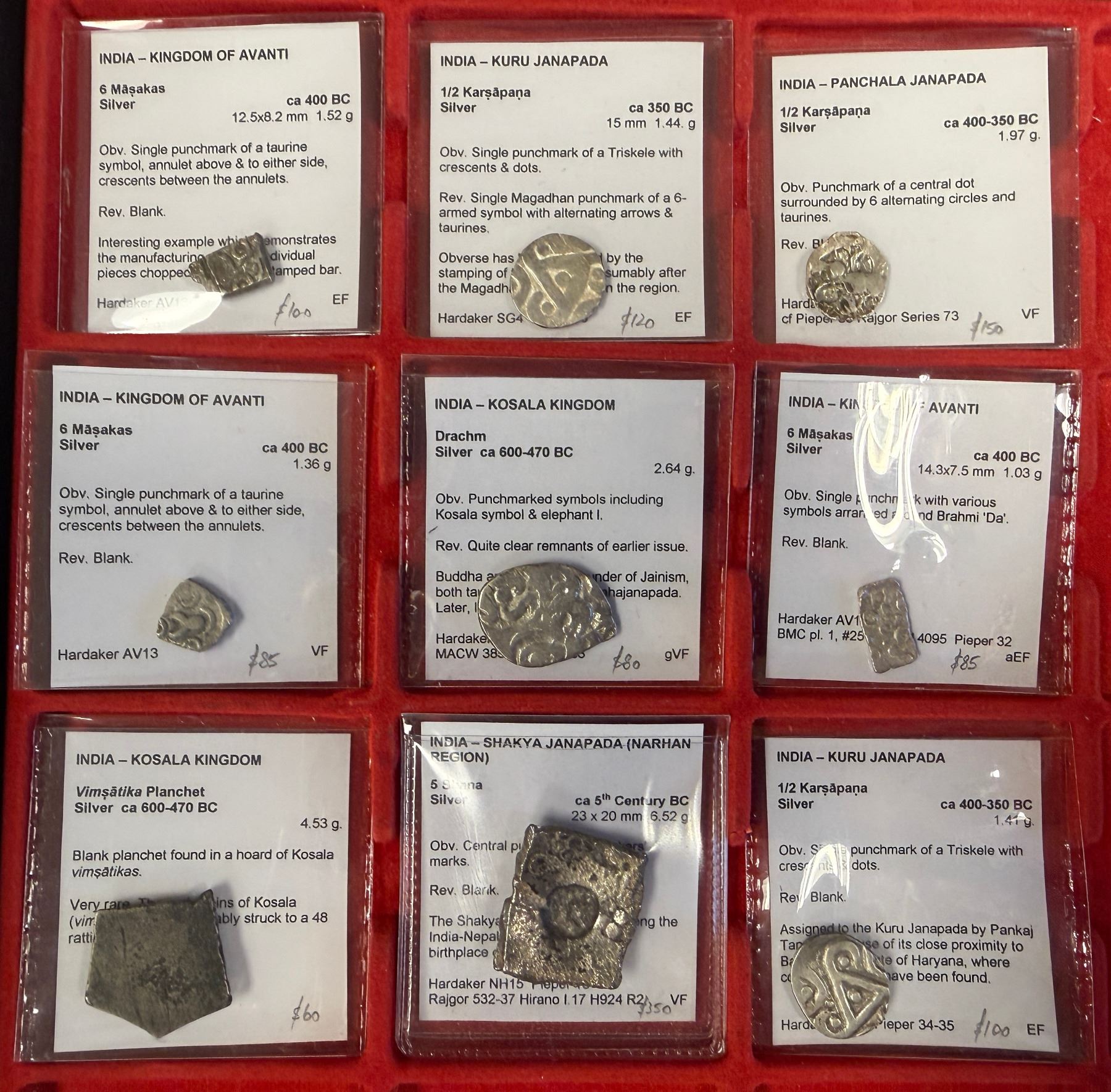 ANCIENT INDIA: LOT of 9 ancient punchmarked silver coins, various Janapadas, including Narhan (Shakya) (6.52g, uncertain type, porous surfaces); Kosala (2 pcs, 2.64g and 4.53g, the heavier one just a blank piece found with a Kosala hoard, according to the consignor); Panchala (1.97g), Kuru (2 pcs, 1.41g, 1.44g); and Avanti (3 pcs, 1.36g, 1.52g, 1.03g); average VF, a couple quite nice (only the Nahran is much lower grade); all with Todd's full description; retail value $600, lot of 9 pieces, ex Ian Todd Collection.