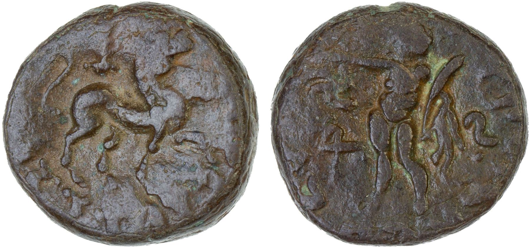 ANCIENT INDIA: Rajuvula, ca. 25-15 BC, AE/lead unit (7.10g), Pieper-1281, lion advancing to right, palm branch above // Herakles standing, holding club and lion's skin, swastika left; average strike, F-VF, RR.