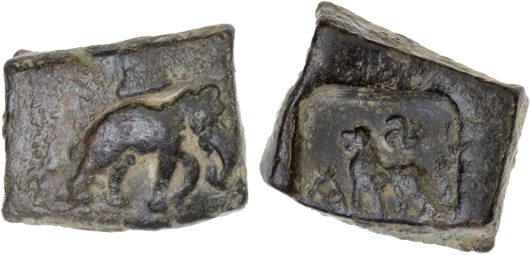 TAXILA: Anonymous, 2nd century BC, AE rectangular unit (10.52g), Pieper-1494, lion left, facing a hill, swastika above // elephant right, hill above, bold VF, R.