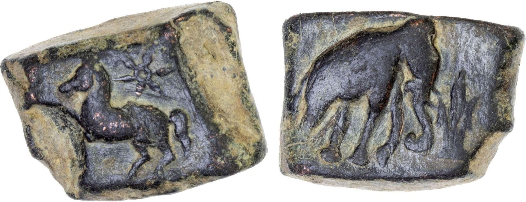 TAXILA: Anonymous, 2nd century BC, AE rectangular unit (8.51g), Pieper-1500, horse left, star above // elephant right, facing a lotus plant, strong VF, RR. The horse type is much rarer than the lion type, which is also with elephant reverse.