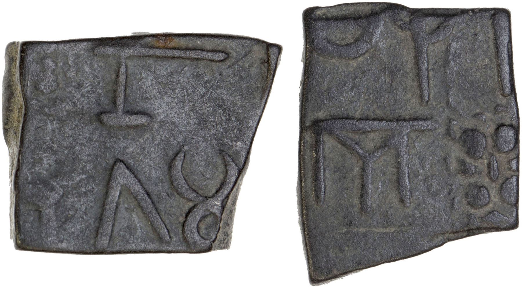TAXILA: Guild series, 2nd/1st century BC, AE square unit (3.68g), Pieper, Zeno-238522 (this piece), Brahmi negama ("guild'), uncertain symbol below (steelyard?) // Kharosthi negama, monogram and symbol below, VF, RR.