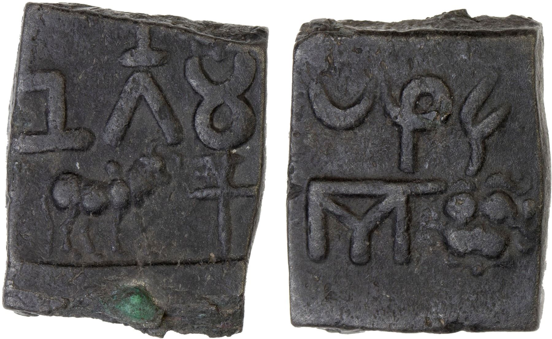 TAXILA: Guild series, 2nd/1st century BC, AE square unit (7.36g), Pieper, Zeno-238505 (this piece), Brahmi negama ("guild"), bull and Indradhvaja below, uncertain symbol above // Kharosthi negama, monogram & facing lion below; wonderful example! VF-XF, RR.