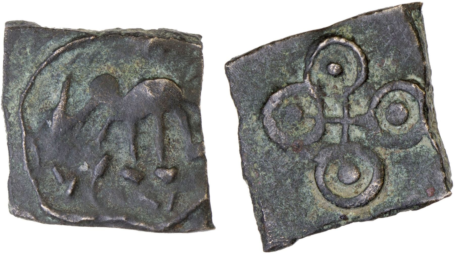 UJJAIN: Anonymous, 2nd/1st century BC, AE square unit (1.70g), Pieper-745-var, elephant left within a circle // Ujjain symbol, bold VF, R.