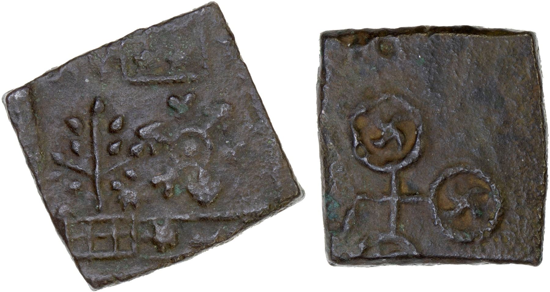 UJJAIN: Anonymous, 2nd/1st century BC, AE square unit (4.87g), Pieper-766, railed tree, 6-arm symbol, fish-tank, Indradhvaja, several tiny symbols // Ujjain symbol with swastika within each orb, XF, RR.
