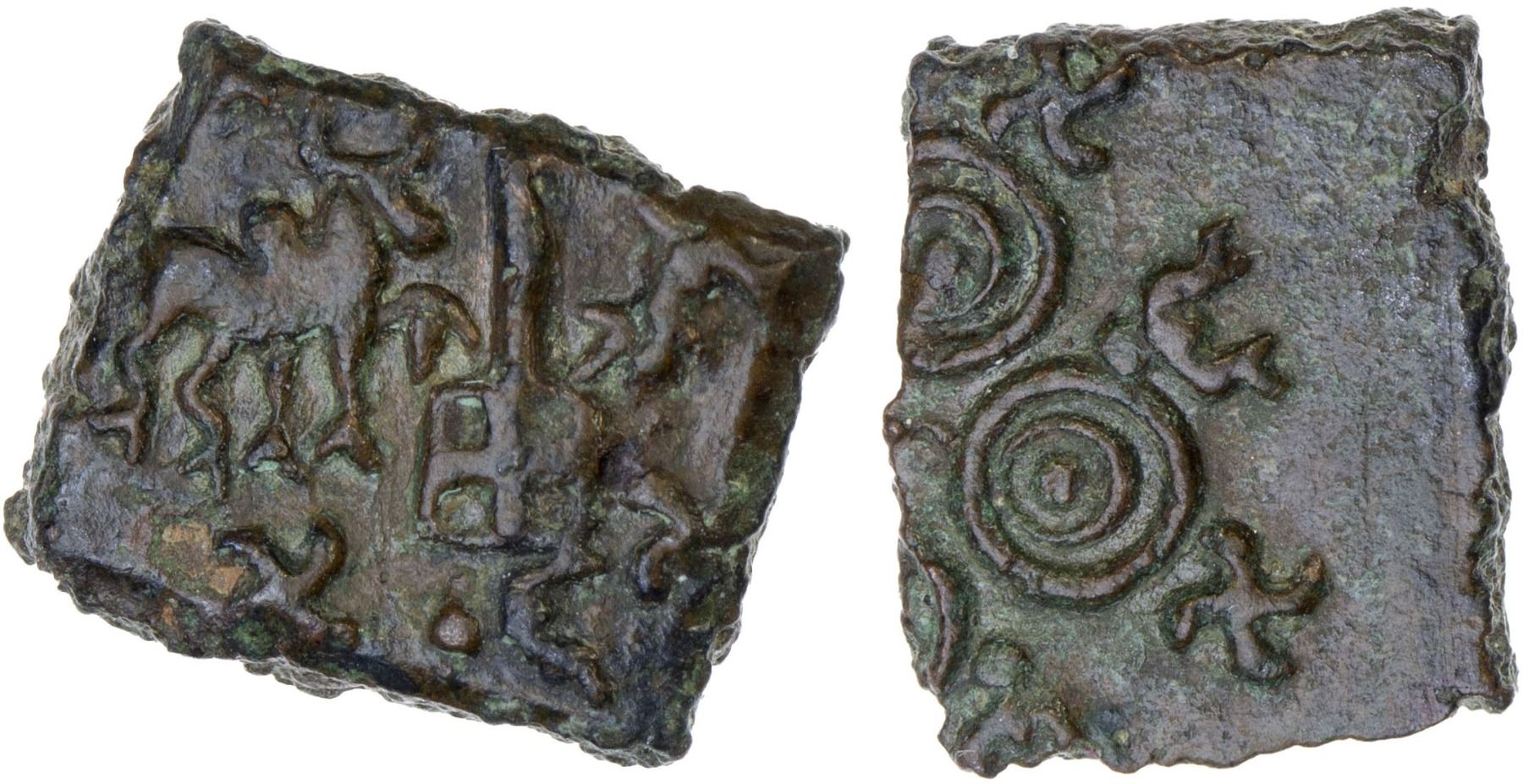 UJJAIN: Anonymous, 3rd/2nd century BC, AE square unit (1.79g), Pieper, bull right, swastika below, railed tree to right // Ujjain symbol, with alternating 4 nandipadas and 4 taurines around, choice XF-AU, RR.
