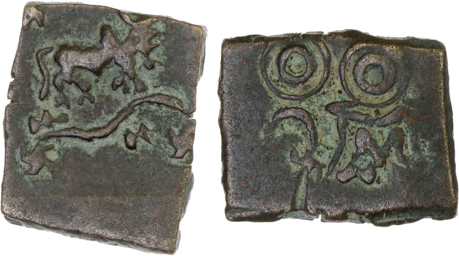 VIDARBHA: Sebaka, ca. 150-100 BC, AE square unit (2.48g), Pieper-2469-var, bull right, river below, two swastika below the river, probably no legend // dynastic Sebaka symbol; attractive example, strong VF, RRR. Fractional size, as most of the Sebaka and related examples cited by Pieper are in the 5.0-10.0g range.