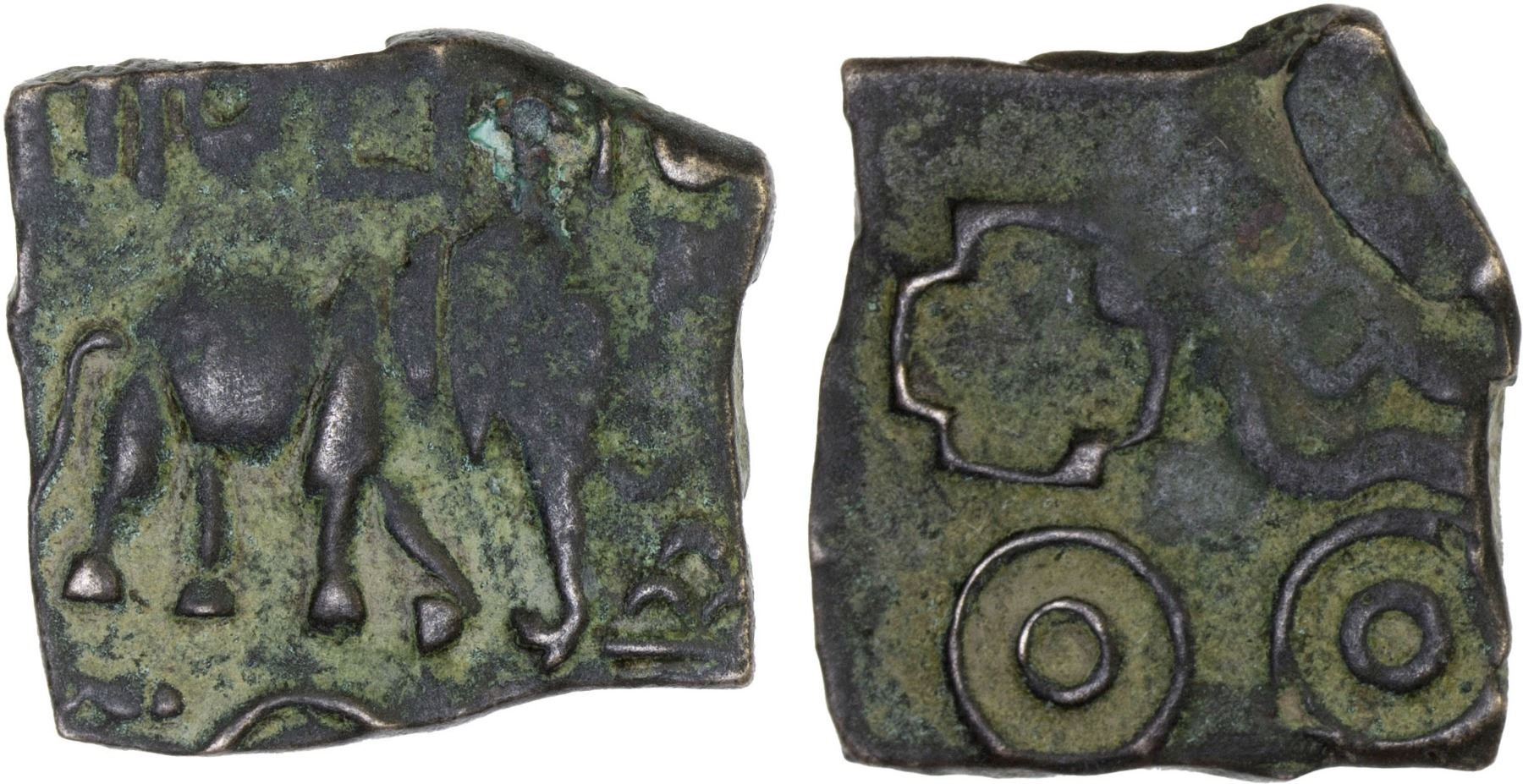 VIDARBHA: Sebaka, ca. 150-100 BC, AE square unit (6.14g), Pieper-2476, elephant right, hill to right, river below, legend ramha sebakasa above // dynastic Sebaka symbol (variant with hollow cross & nandipada at the top), VF, R.