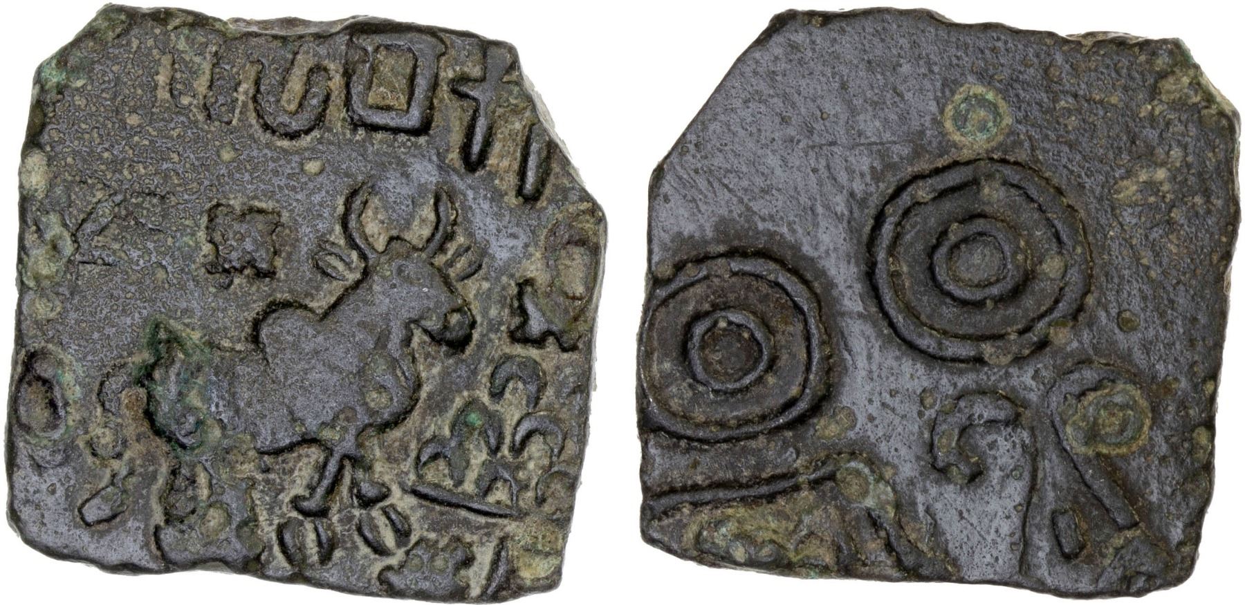 VIDARBHA: Sebaka, ca. 150-100 BC, AE square unit (6.91g), Pieper-2468, bull right, 2 swastikas above, 6-arch hill to right, Indradhvaja to left, legend ramha sebakasa above // dynastic Sebaka symbol, attractive VF, R.