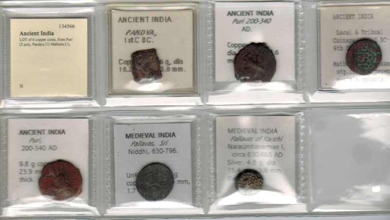 ANCIENT INDIA: LOT of 6 copper coins, from Puri (2 pcs), Pandya (1) Mathura (1), and medieval Pallavas (2), mostly fine, lot of 6 coins, ex. John Page Collection.