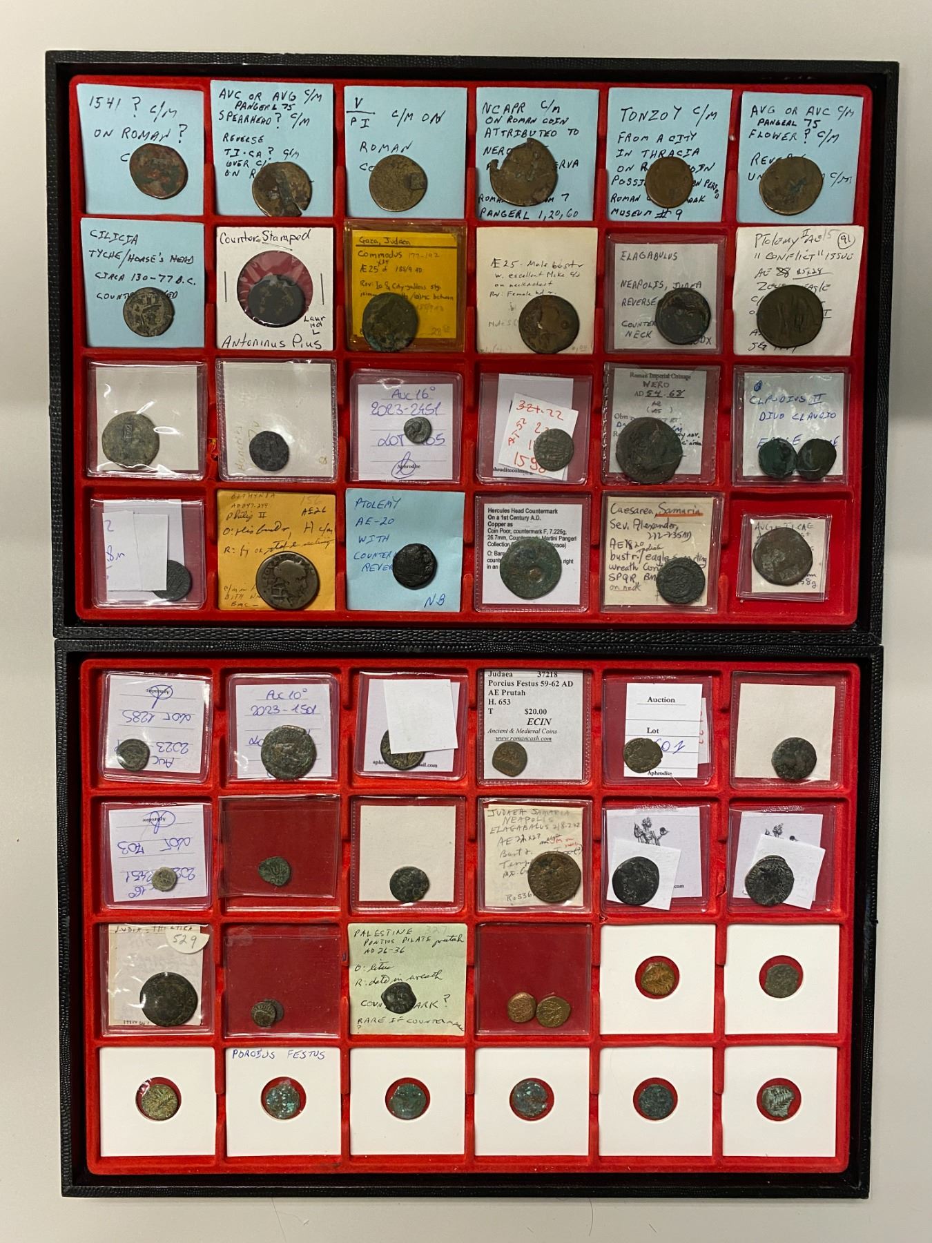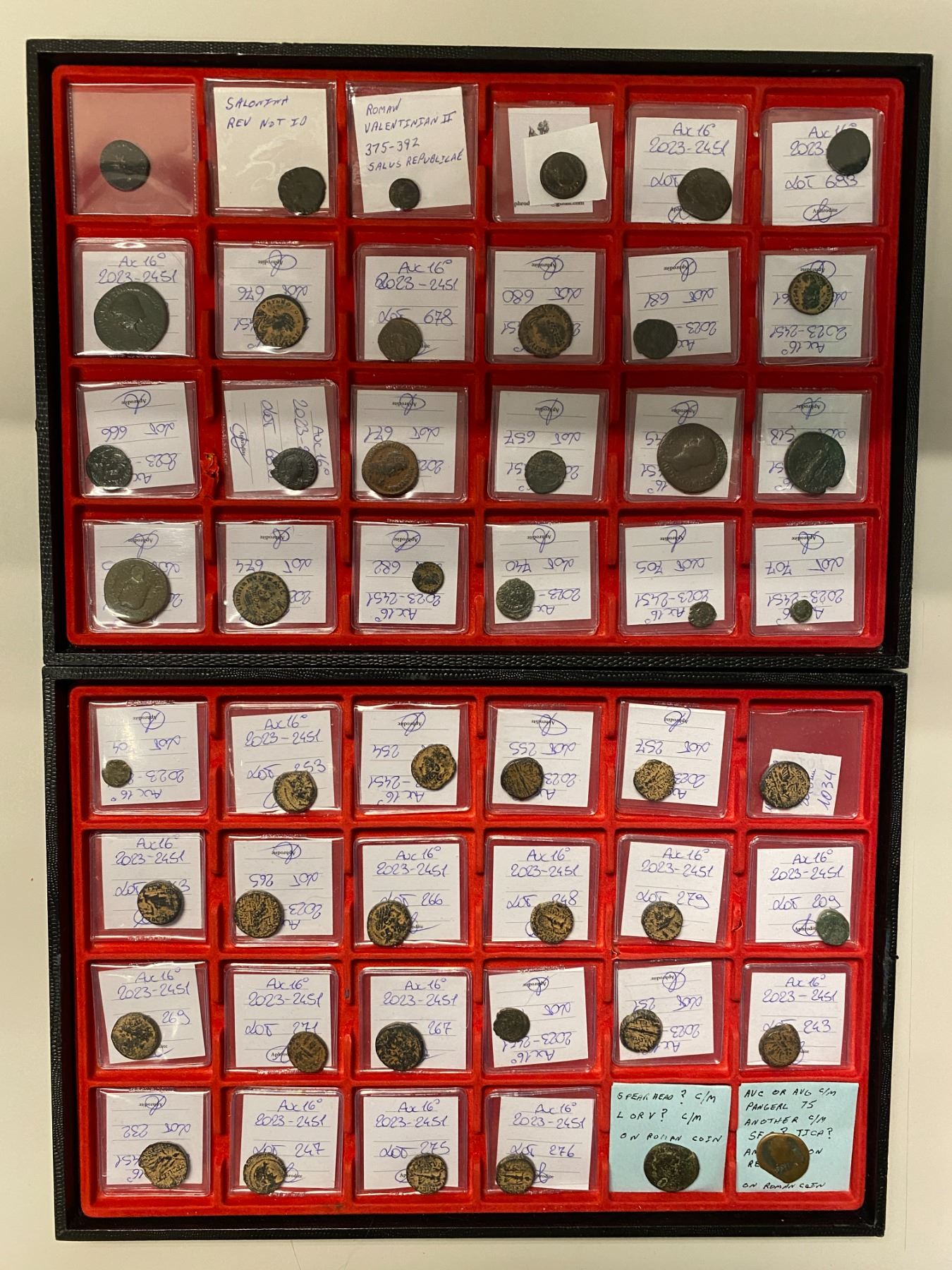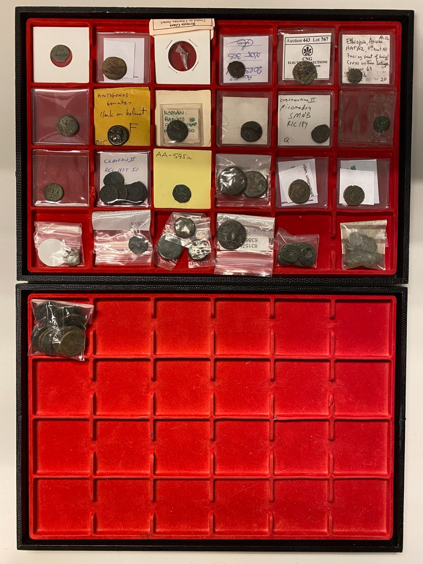 ANCIENT: LOT of 166 coins, all bronze, about half Roman (mostly imperials with some Provincial, most small late bronzes with a few earlier sestertii and dupondii), the rest various Greek coins (incl. 2 of Axum), plus a fragment of Roman glass; most in average circulated conditions, many quite worn, some with old corrosion; retail value $500, lot of 166 pieces.